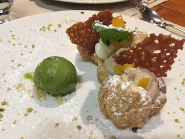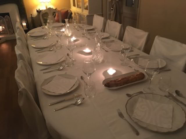 Repas à la table d’hôte The Corner, dans la très belle salle à manger, où le feu de bois dans la cheminée ajoute à la chaleur de la décoration. Potage de «pumkin» (potiron), noix de Saint-Jacques, filet de bar et pana cota aux framboise, le tout largement arrosé par Diane d’un pinot gris de Loire.