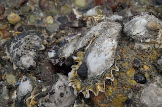 Malgré le froid (on est super bien couverts) nous découvrons plein d’endroits sauvages, à cette saison. Nous adorons toutes ces belles maisons de style balnéaire qui donnent envie de s’installer sur leur terrasse dans une chaise longue et de regarder la mer pendant des heures, On voudrait aussi partager ces grandes maisons avec toute la famille. Pour aujourd’hui, nous nous contenterons de longer ces grandes plages. Pierre en profite pour faire une « choré » que je filme et qu’il poste sur Facebook pour ses ami(e)s du sport. Nous tombons aussi sur un rocher peint avec un gros poisson (une Morue ou un Thon ???) et le prénom « Pierre » au dessus. Photo obligatoire ! Nous nous engageons sur un passage à découvert qui mène à un petit îlot recouvert de moules et d’huîtres sauvages, que des pêcheurs à pied tentent de décrocher de leurs rochers. Pierre s’inquiète que la marée recouvre le passage … mais en fait, la mer descend encore : ouf, sauvé des eaux :-) !