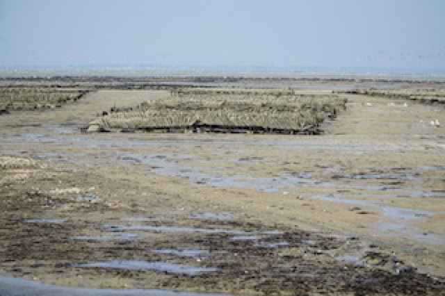 Et c’est reparti pour une deuxième grande boucle à vélo, vers le Sud cette fois. C’est un tout autre paysage, de plaine avec des champs de pommes de terre et des marais salants. Au début, nous avons un fort vent dans le dos: nous n’avons même pas un souffle de vent relatif sur le visage ! A l’Est de l’île, nous arrivons dans un port ostréicole, Le Bonhomme, protégé par une digue, au bout d’une longue ligne droite. Le vent de face est si puissant que nous n’arrivons à pédaler jusqu’en haut de la digue ! Ça décoiffe grave :-) mais le paysage ostréïcole est très beau. Nous rejoignons ensuite l’Ouest de l’île en traversant la Guérinière à l’abris du vent et c’est tant mieux.Mais suite à une petite erreur de guidage, nous nous retrouvons cette fois à remonter le côté Ouest, face au vent du Nord. C’est vraiment dur d’avancer, surtout pour s’apercevoir au bout de la route que c’est un cul de sac et que ce n’est pas le chemin pour revenir. Nous rebroussons chemin et finissons par trouver l’entrée du chemin qui traverse les marais salants. Le jour commence à tomber et c’est une impression un peu curieuse de se trouver au milieu de ce dédale de marais et de canaux … surtout quand nous entendons quelques coups de fusils aux alentours. Bon, difficile de nous confondre avec des bécasses, quoique qu’il existe bien des chasseurs qui confondent faisans et surfeurs … Mais finalement, en suivant le chemin pris par un scooter qui passait par là, nous retournons finalement sans encombre et vivants à Noirmoutier, après 23 km cette fois.