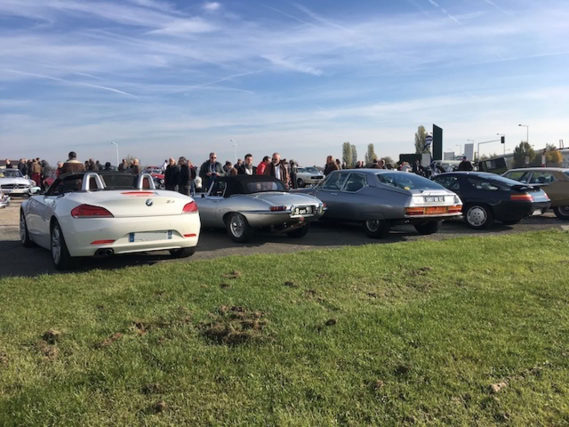 Je quitte Marc et Stéphane à 10h ce dimanche matin (ils emmènent leurs nièce à Belwaerde) et en attendant le déjeuner en famille à 12h30, je décide d’aller regarder passer les avions à Bondues car il fait beau et c’est l’occasion de s’aérer. Et quand j’arrive au terrain de Bondues, avec mon cabriolet blanc, je remarque quelques voitures anciennes sur le parking adjacent. Un monsieur s’approche de ma Z4 et engage la conversation. Il a une Z3. Il m’explique qu’il y a un rassemblement tous les premiers dimanche du mois, normalement pour les voitures d’avant 1975. Néanmoins, comme je vois des voitures un peu plus récente, je décide de rejoindre ce rassemblement avec ma 2009 :). Et c’est comme ça que je me retrouve de façon inattendue au milieu de dizaines de voitures magnifiques qui arrivent de façon continue jusqu’à midi. C’est magique. Et au passage, ma Z4 attire pas mal de curieux. Mais évidemment, rien de comparable avec la Jaguar Type E cabriolet qui est venu se garer à côté. Il y a une magnifique brochette de Citroën SM. Je discute avec le propriétaire d’une Porsche 928 S4, responsable du Club 928-Nord et on échange nos coordonnées. Il me donne l’adresse d’un garage à St Amand, et il a peut-être 4 jantes d’origine à me proposer pour ma 928.