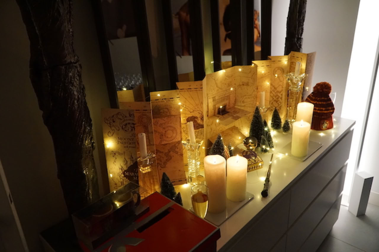 Les Morues sont parmi les premier(e)s arrivé(e)s. Notre Morue St. a réalisé une superbe décoration, à la fois intime, chaleureuse … et dans le thème Harry-Potter. St. a accroché au mur plusieurs grands tirages photos de Morue Ma., récente ou remontant à sa jeunesse (pas si lointaine 😀!) : c’est vraiment chouette et c’est un beau cadeau pour Morue Ma.