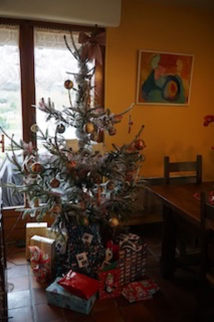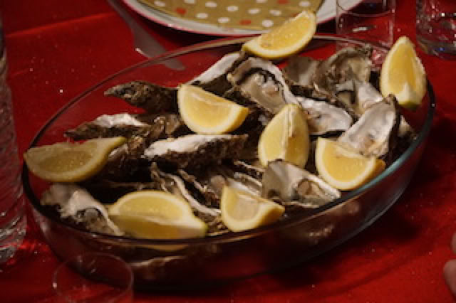 Apéro traditionnel avec les toasts au pâté maison, le foie gras maison et du Champagne sans beaucoup de modération ! C’est la jeune G. qui fera cette année la distribution des cadeaux, le Père Noël s’étant trahi l’année précédente par son excès de minceur … Et c’est vers 21h50 que nous passons à table pour le diner du réveillon. Huîtres (ouvertes d’une main experte par Xavier), confit de canard … et surtout, la ribambelle des desserts : LA soupe de cerises, les îles flottantes, les oeufs au lait, les tartes … Mon moment préféré ! 😀 Comme d’habitude, les conversations sont … animées et parfois bruyantes, les jeunes en bout de table étant finalement beaucoup plus tranquilles !
