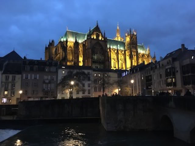 Journée tranquille et cette fois, ensoleillée. Les clétiens repartent en début d’après-midi. Ensuite, Josiane, Pierre et moi emmenons G. à Metz pour profiter de la patinoire. Pendant une demi-heure, Pierre et G. vont tourner ainsi sur la patinoire, d’abord très prudemment. Puis G. osera faire deux ou trois tours seule, sans tenir la main de Pierre. Après la patinoire, nous traversons les rues commerçantes animées pour rejoindre le « Sentier des lanternes » au bord de la Moselle, dominée par la belle cathédrale de Metz très joliment éclairée. Ce parcours sous les lampions et bordé de personnages lumineux est vraiment un plaisir pour les yeux, encore plus pour les enfants. Puis retour à Mance où Pierre nous préparera une excellente soupe pommes de terre, carottes, lentilles et lardons. Parfaite pour finir sainement ce copieux week-end. Heureusement, il reste un peu de soupe de cerises ! Soirée Mary Poppins à l’étage, mais la petite G. s’endormira au milieu. En bas, Bernard et moi regardons Sayonara (non, pas une seule scène de combats aériens … décevant !)