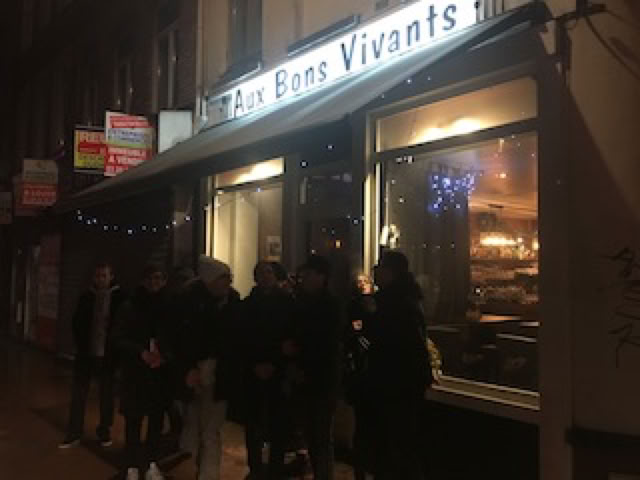 Avec Pierre et Matthieu, nous allons ensuite passer la fin d’après-midi à Roubaix chez Annie et Thierry, Annie qui nous gâtera avec quelques bonnes crêpes : miam ! Puis nous repartons sur Lille : Matthieu fera le chauffeur d’élite pour Fatima avec la Série 1. Nous arrivons un peu avant 20h30 « Aux Bons Vivants », un sympathique restaurant recommandé par Emeric, dans le quartier de Wazemmes. Marc et Stéphane nous attendent déjà, et nous sommes bientôt rejoints par Philippe et Philippe-Henry, Emeric, Léa et Julie, Tristan. Avec Matthieu, Pierre, Fatima et moi, c’est donc une belle et sympathique tablée de 12 qui s’installe.
