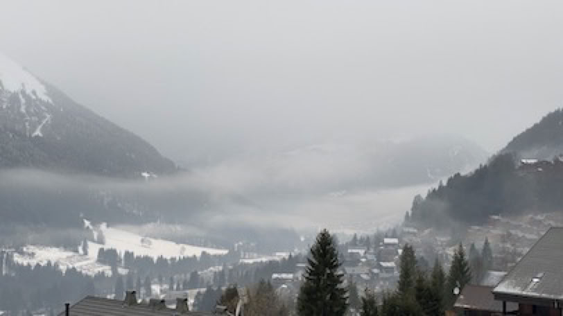 En haut, pas question de faire la piste de l’épervier : on voyait la terre par endroit depuis le télésiège. Nous commençons donc par descendre vers Super Châtel, dans la brume … et avec une neige qui colle ! Ce n’est pas de la « soupe », mais la neige colle sous le ski : ça n’avance pas, voire ça freine par moment, et pas toujours de la même façon sous les deux skis. Inutile de préciser que sur les faux-plats du côté de Chalet-Neuf, il faut bâtonner ! Bref, ce n’est pas très agréable, voire fatiguant. Nous tournons quand même un peu sur le domaine de Super-Châtel.