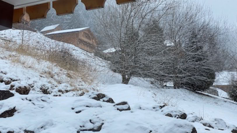 Il fait gris, il neige le matin, mais la neige va rapidement se transformer en pluie en milieu de journée, et Pierre a une grosse migraine … Ce sera donc une journée entre parenthèses. Histoire de ne pas rester complètement inactif, je descends quand même au village dans l’après-midi pour profiter de l’espace aquatique « Forme d’O » et faire mes 1600 m crawl habituels dans l’un des 3 couloirs de nage. Je remonte sous la pluie, et comme il ne fait pas froid, je vois la neige fondre à vue d’oeil …