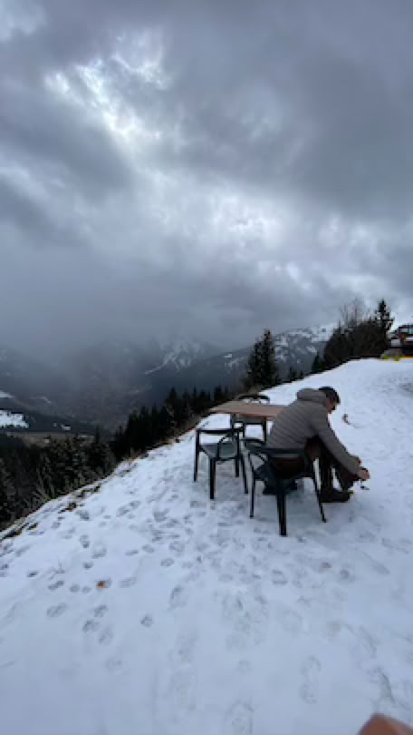 La météo ce matin-là ne permet pas décemment de skier … et je n’ai pas très envie non plus. Il y aura une fenêtre météo mercredi ! Pour compenser, nous partons en milieu de matinée pour le Chalet du Mouët (encore … mais c’est une randonnée qu’on aime bien). Nous montons un peu plus vite que deux jours avant avec ma belle soeur (mais l’important, c’est de le faire, pas de faire un chrono) et nous arrivons au chalet sous une drôle de neige qui ressemble plutôt à du gros sel. Nous prenons un verre à l’intérieur car il fait trop humide pour rester dehors. Le chat de la maison vient ronronner un bon moment sur mes genoux, jalousé par le chien. Redescente rapide. Déjeuner et repos, Pierre descend à Châtel chercher le pain puis enchaîne sur une visio professionnelle. Dîner, repos … Oui, on se repose beaucoup. Le soir, nous regardons un film très triste (« Une âme secrète ») … Dans la nuit, on voit au loin les phares des dameuses qui s’évertuent à refaire de belles pistes malgré le mauvais temps …