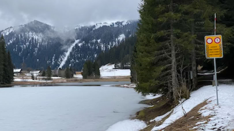 Pierre se lève tôt pour regarder le temps par la fenêtre, pour savoir si l’on peut aller skier … et la réponse est clairement non (pluie, nuages …). Bref, de nouveau une modeste grasse-matinée pour moi. Néanmoins, vers 11h, le temps s’est un peu calmé et nous décidons de faire un tour au Lac de Vonnes. Pour cela, en descendant vers Châtel, nous empruntons le chemin qui passe derrière le village : nous ne sommes pas déçus ! Le chemin est boueux et très glissant. C’est un miracle si nous ne nous retrouvons pas les fesses dans la boue, surtout en descente. Nous arrivons néanmoins au Lac de Vonnes, et plutôt que de retourner directement, nous décidons d’essayer le chemin qui part près du parking du télésiège et qui monte vers le Lac de Morgins. C’est encore un peu boueux et glissant, mais nous arrivons néanmoins en moins de 20’ au lac de Morgins, encore gelé, lui. Le plus étonnant, c’est que ce chemin est beaucoup plus direct et moins escarpé que celui que nous empruntions jusqu’à présent (en été) pour nos retours de randonnées. L’impression d’avoir trouvé un raccourci dans l’espace-temps !
