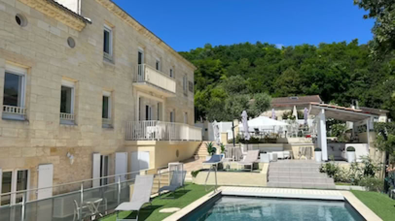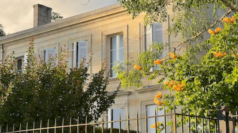 Notre hôtel est en fait une belle maison d’hôte, le domaine de la Corniche, à La Reuille. La maison a une belle vue sur la Gironde et le Bec d’Ambes. L’extérieur est dans cette belle pierre de Bordeaux (de Bourg, en fait), l’intérieur est plus kitch, avec marbre blanc et décoration façon Versace.