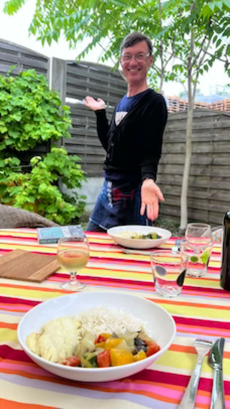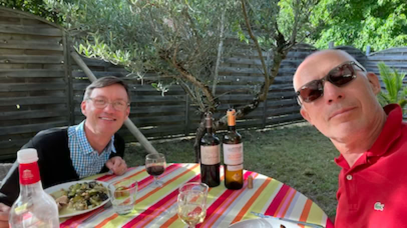 Retour rapide à la maison, déjeuner, repos, sieste … Nous reprenons nos vélo pour un tour au Pyla. Tout au bout, le quartier de la Corniche, avec sa vue sur le Bassin et ses somptueuses maisons d’architecte, impressionne toujours. Histoire de faire un peu plus de vélo, nous retournons par le site de la Dune du Pyla (sans s’y arrêter) et la Teste de Buch. Et presque à la fin, juste dans une petite montée, ma chaîne de vélo casse lors d’un changement de vitesse. C’est donc en utilisant mon vélo comme une draisienne et en profitant des descentes que je rejoins la maison. Pierre a pris de l’avance pour préparer le repas. En apéritif, je me prépare mes six énormes huitres qui seront parfaites avec mon verre de Côte de Blaye blanc bien frais. Pour le diner Pierre avait préparé du poisson avec une ratatouille.