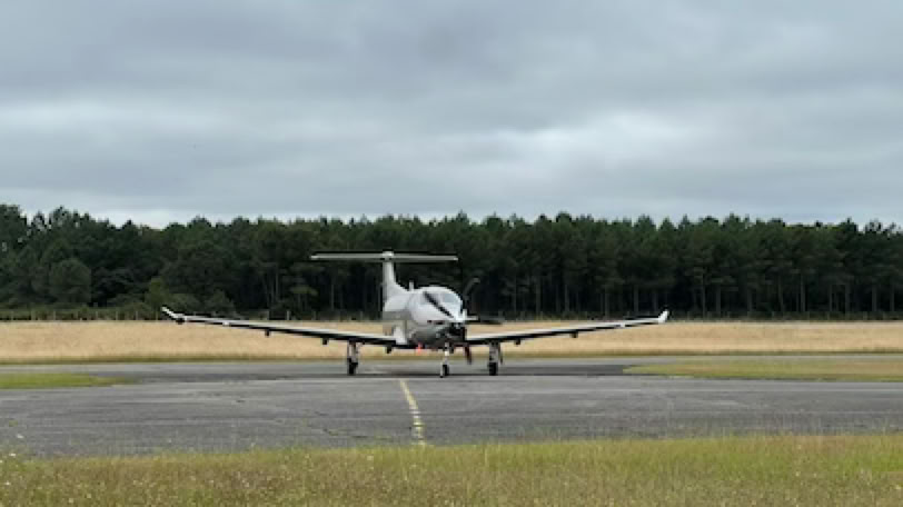 Il fait un peu gris ce matin. Nous prenons nos vélos et faisons d’abord une pause café au Barathym. Et nous prenons ensuite la direction de l’aérodrome d’Arcachon. Sur place, pas de trafic sur l’aérodrome. Un couple qui vient d’arriver avec son hélicoptère Bell-Ranger le prépare tranquillement pour stationner quelques jours sans doute. Sur le tarmac, un TBM et un Citation sont garés. Nous allons repartir quand arrive en finale, tous feux allumés, un beau Pilatus en provenance du Bourget. Il se pose, avec le bruit caractéristique de la turbine et de la grosse hélice en reverse. Impressionnant. Le Pilatus vient rapidement se parquer devant la tour. Un homme élégant en descend et partira quelques minutes après dans son taxi qui l’attend déjà. Pratique pour vernir à Arcachon ! Les deux pilotes eux, repartiront avec l’avion dans une heure. Pas d’autre trafic, et nous reprenons les vélos pour le retour, mais en passant au Sud de l’aérodrome, par une longue route fréquentée et sans piste cyclable, pas très agréable.