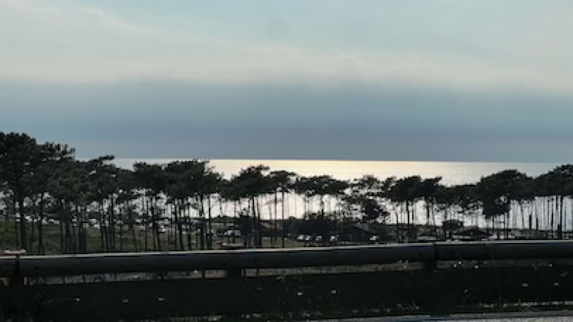 Et c’est reparti à 10h pour un tour du Bassin à vélo, sur notre itinéraire «traditionnel» cette fois. Première petite étape à Biganos (25 km) dans une boulangerie pour acheter des sandwichs et des boissons, et prendre un café. Puis la très longue ligne droite du fond du Bassin. Arrivé à Andernos les bains (45 km), nous allons jusqu’à la jetée pour prendre quelques photos, mais nous poussons jusqu’à Ares, que nous ne connaissons pas encore, pour notre pause déjeuner. Arrivée au bord de l’eau (enfin, c’est une façon de parler : la mer est basse, partie très loin de la côte), nous prenons des photos rigolotes dans la soucoupe volante qui ressemble fort à celle de La Soupe aux Choux, puis nous nous asseyons sur un banc à l’ombre des grands arbres pour notre pique-nique. Et après, un café, nous reprenons la route vers la plage du Truc-Vert, au Nord du Ferret. Sous les pins, la piste cyclable est défoncée et parfois le macadam a disparu. Nous arrivons néanmoins sans problème au Truc-Vert. La plage est toujours magnifique avec une très belle couleur de l’eau et de belles vagues. Par contre énormément de monde (beaucoup d’allemands). Nous profitons néanmoins de l’eau et du soleil pendant une bonne heure et demie. Je joue dans les vagues … dans la zone surveillée.
