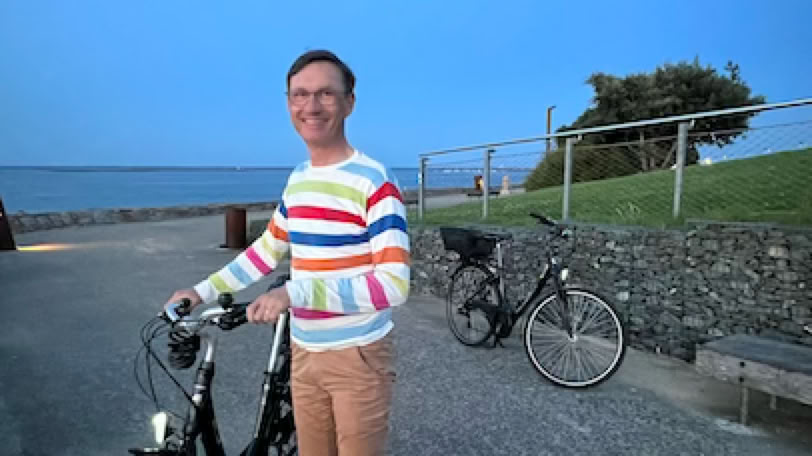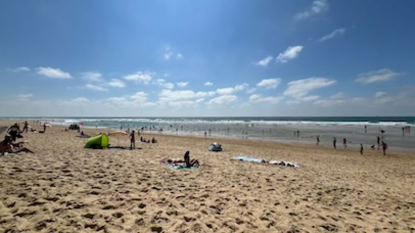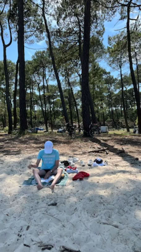 Réveil (un peu) plus tôt. Après un rapide petit-déjeuner, direction le Moulleau pour aller échanger mon vélo. C’est rapidement fait et nous allons prendre notre café allongé à «L’Oubli» en regardant passer les voitures. Comme il fait beau, nous allons nous installer sur la plage, à gauche de la jetée. Pierre lit pendant que je fais quelques longueurs dans la mer un peu agitée. Retour à la maison en fin de matinée, déjeuner avec une bonne salade de riz préparée par Pierre et … repos ! A 16h, nous décidons d’aller à vélo vers les plages de l’Océan. C’est la première fois que nous y retournons depuis les terribles incendies de 2022. Et malheureusement, le spectacle est bien au-delà de nos pires craintes. Il n’y a simplement plus de forêts entre le site du Pyla et les plages de l’océan 7 km plus au Sud. Des campings ont disparus. Le fameux camping des Flots Bleus est certes là mais avec des mobiles homes neufs, sans arbres autour. La dune, qui était jusque là masquée par la forêt, apparaît sans obstacle. La route et la piste cyclable serpentent au milieu d’une sorte de steppe. S’il n’y avait pas les côtes et les descentes que nous connaissons bien sur la piste cyclable, nous ne saurions pas dire précisément où nous nous situons. C’est terriblement déroutant. Nous arrivons néanmoins à la plage de la Salie Nord pour une courte pause sur la plage. J’en profite pour jouer avec les grosses vagues de l’Océan, dans la zone surveillée ! Retour et, dans la grosse montée de la «Maison Blanche» (une boîte de nuit … brûlée elle aussi), j’ai de nouveau ma chaîne qui saute, mais qui ne casse pas cette fois ci. Un peu compliquée à remettre … et j’ai les mains complètement noire de cambouis après ça. Sinon, fin du trajet normale.
