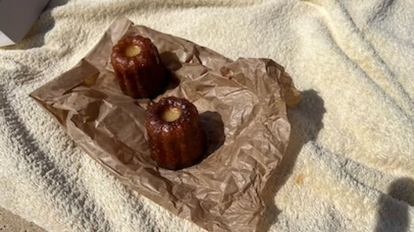 Profitant de notre journée supplémentaire, nous décidons d’aller à la plage de La Lagune côté Océan. En passant au Moulleau, nous prolongeons la location des vélos d’une journée, puis nous postons les cartes au Pyla, et enfin nous continuons vers l’Océan. Arrivée sur la plage, naturiste, au Sud de La Lagune. Nous avons la plage presque pour nous, très peu de monde, il fait bon et l’océan n’est pas trop agité. Nous profitons d’abord d’une excellente baignade, l’eau est très bonne, même Pierre y va : c’est dire ! Puis un bon moment tranquille au soleil pour une fin de journée vraiment très agréable. Pierre a même amené deux canelés, dégustés sur la plage. Il faut quand même penser à reprendre les vélos et remonter les fameuses côtes, mais ça se fait finalement sans trop de difficultés.