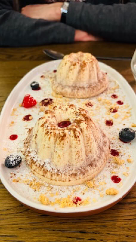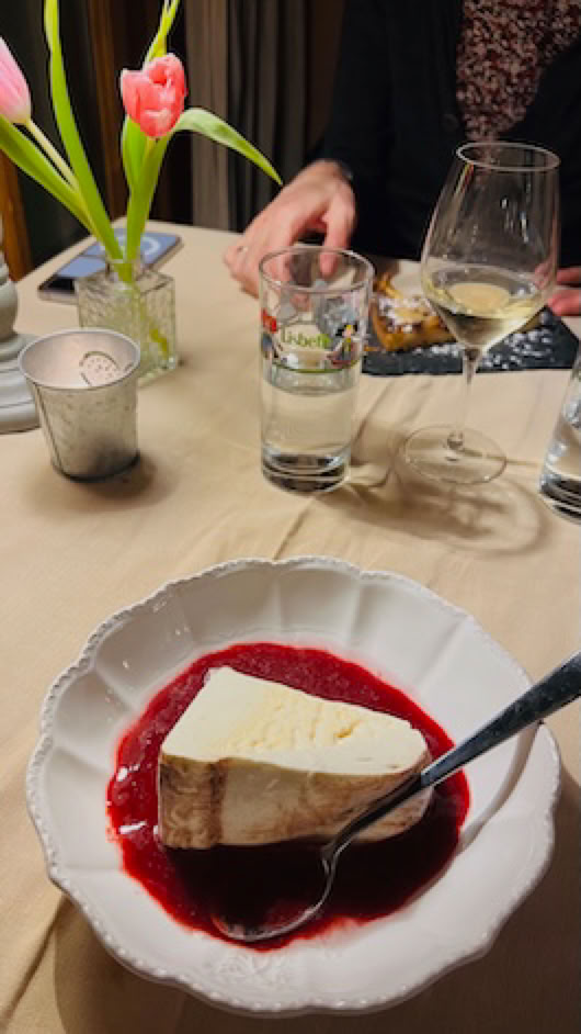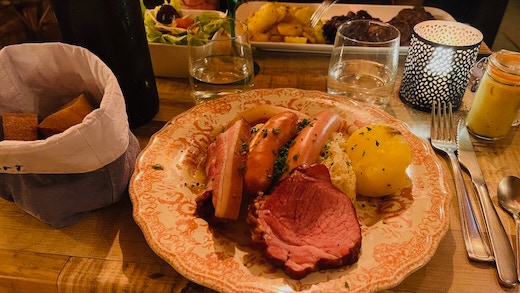 Retour à Colmar. Dîner dans un restaurant un peu loin du centre, à la décoration noir et fushia pas du tout typique, mais bien noté. C’est bon, mais nous sommes quasiment les seuls clients : pas une super ambiance.
