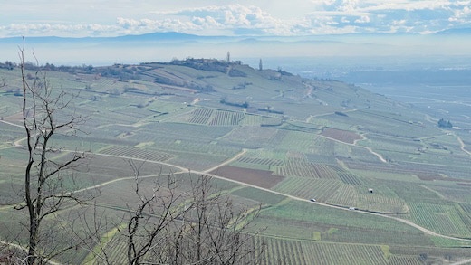 Aujourd’hui, nous allons marcher ! Pierre a trouvé un itinéraire sympa qui part du petit village alsacien typique de Kienstheim à 80 km de Colmar. Nous nous garons près de la porte de ce village. La route monte d’abord doucement entre les vignobles, puis après un calvaire, monte nettement plus fort dans la forêt. Mais de là haut, nous avons une belle vue sur les vignobles et au delà, sur les Vosges. Après deux bonnes heures de marche, nous arrivons au très typique village de Riquewihr. La rue pavée principale est bordée de maisons à colombage colorées. Peu de monde à part un groupe scolaire. Ca doit être très très différent en saison … Nous trouvons in-extremis une échoppe pour y acheter un Bretzel pour Pierre et un donut (trop gras) pour moi, histoire d’avoir quelque chose dans le ventre pour le retour. Après un tour rapide dans les petites rues, nous prenons un autre chemin pour le retour, avec un ciel qui se fait de plus en plus menaçant. En pressant le pas, nous arrivons à la voiture, à Kienstheim, alors que l’averse commence. Juste le temps de se mettre à l’abri du hayon pour changer de chaussures.