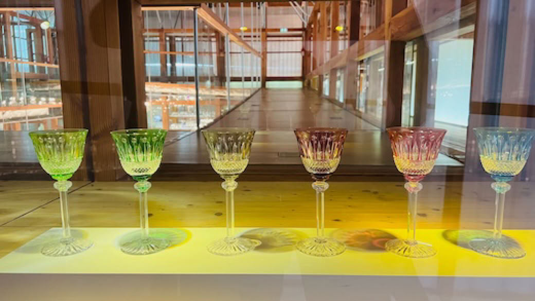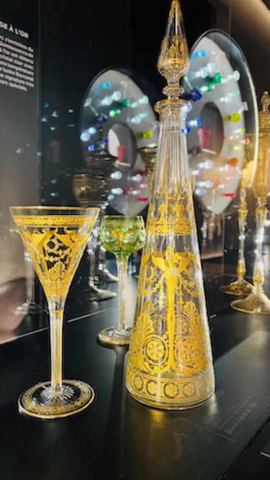 Vient ensuite le moment attendu de la visite guidée de la manufacture et nous ne sommes pas déçus ! C’est juste incroyable de voir le ballet de ces maîtres et apprenti(e)s, sortir le cristal en fusion du four, le transporter au bout de leurs cannes, le tourner, le former, l’assembler le pied à la paraison, jusqu’à produire un verre ou un vase, avec des couleurs, et le mettre à refroidir. Dans un autre atelier spécialisé dans les presse-papier (« sulfures ») , nous assistons au façonnage de tiges de verre que les deux compagnons étirent sur plusieurs mètres : incroyable. Et pour terminer, visite de l’atelier de taille, où les compagnons taillent les verres, ou des vases de plusieurs kilos, aidés seulement par quelques traits tracés sur le cristal. Un travail d’une incroyable précision. C’est magique. Bref, une visite vraiment passionnante où l’on ressort plein d’admiration pour le savoir faire de ces hommes et femmes.