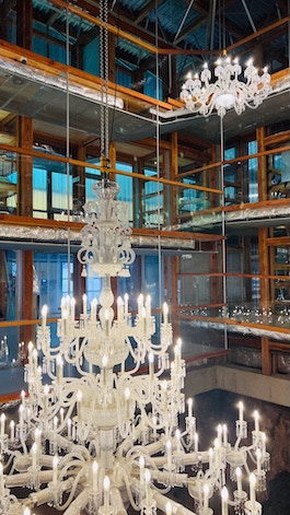 La petite ville présente assez peu d’intérêt, en dehors évidemment de sa célèbre cristallerie … qui ne se visite pas, et de son église Saint Remy, reconstruite en béton après la guerre et parée de vitraux composés de cristaux colorés de Baccarat (voir photo en haut de la page). Et donc nous visitons le musée « officiel » de la marque Baccarat. Evidemment, les pièces présentées sont magnifiques, présentées dans une ambiance sombre qui met en valeur la lumière qui traverse les pièces en cristal. Quelques pièces plus contemporaines sont présentées, ainsi que quelques magnifiques lustres. Malheureusement, le musée est réellement petit par rapport à la réputation de la marque et nous arrivons rapidement au café du musée. Très classe, et c’est l’occasion de prendre un café et un Coca dans des verres Baccarat :)