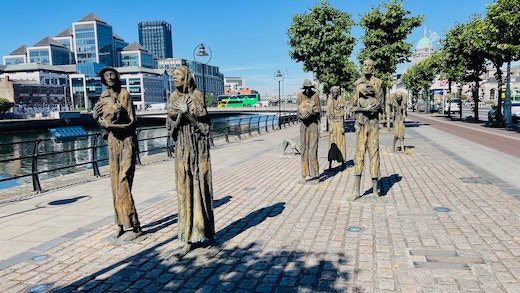 Après un copieux petit-déjeuner à l’hôtel et après avoir déposé nos bagages à l’accueil nous partons pour un grand tour à pied dans Dublin, d’abord le long de la River Liffey. Premier contact avec un évènement qui a fortement marqué l’Irlande, le monument en mémoire de la grande Famine. Puis le pont Samuel Becket en forme de harpe celtique, la Diving Bell, et tout le quartier de Grand Canal Docks. Tout autour sont implantées des grandes sociétés américaines (Google, Ebay …) et les grands cabinets de conseil: l’Irlande, un paradis fiscal ? En tout cas, le quartier est agréable. Histoire de tester les transports en commun, nous testons l’équivalent du RER entre le quartier du Grand Canal et le centre historique. Nous avons déjà beaucoup marché, au soleil, et nous faisons une pause café dans un sympathique café, avec de bons fauteuils en cuir. Puis nous continuons un peu vers l’Est de la ville historique, la Christ Church et son pont qui ressemble au pont des soupirs … au dessus de la rue. Enfin, nous récupérons nos valises à l’hôtel, achetons au passages des sandwichs, et rejoignons la gare routière « busaras » pour prendre notre bus Expressway, ligne 30, qui nous emmènera à Donegal.
