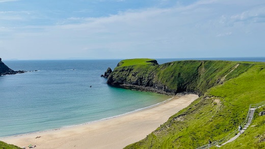 Ensuite la route continue et semble littéralement se jeter dans la mer depuis le haut des falaises, assez impressionnant. La route arrive finalement à un phare, le « Lighthouse Dwellings » : je me répète, mais on en prend encore plein les yeux. Depuis le phare, un chemin descend vers la mer, le long d’un mur de pierres, suivi par une volée de marches bien raides avec juste une corde pour s’assurer, pour arriver au niveau de l’eau, dans un creux de falaise. Pierre descend jusqu’en bas mais « galère » un peu sur les dernières marches. Avec mon vertige, j’hésite un peu à descendre l’escalier : j’y vais quand même, sauf les dernières marches. Impressionant !