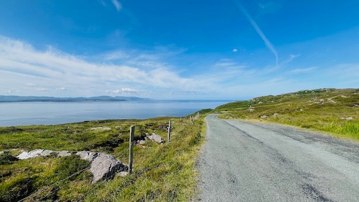 Nous commençons par un paysage côtier d’abord plutôt plat, avec une piste le long de la route. Ensuite, notre chemin bifurque sur une petite route qui monte, qui monte et longe la côte en haut des falaises, avec évidemment de nouveaux points de vue incroyables. Nous reperdons notre énergie potentielle avec une bonne descente, jusqu’à Dungloes puis le petit port de Burtonport.
