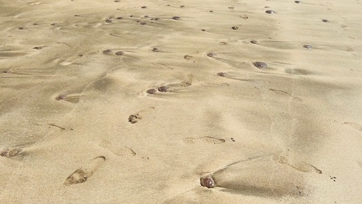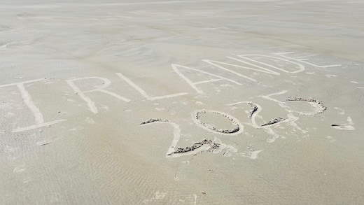 Notre itinéraire nous fait ensuite traverser la péninsule par de petites routes, bordées de lacs, et nous amène plus au Sud, à Rossbeg. Et une fois de plus, au bout d’un chemin dans les dunes, nous débouchons sur une plage incroyable, Ballinreavy Strand, déserte, avec un sable presque blanc et une mer turquoise … Ces plages magnifiques sont pour moi une surprise de notre tour en Irlande. Histoire de laisser une trace … très éphémère, nous traçons dans le sable un « Irlande 2025 » et nous nous prenons en photo devant, toujours avec nos vestes jaunes de cycliste.