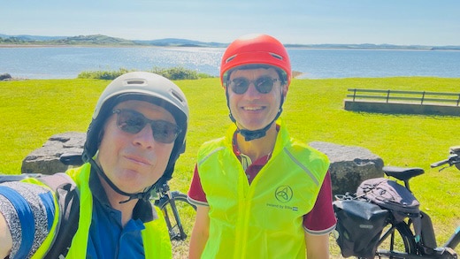 Nous voilà à pied d’oeuvre pour notre première étape. Rendez-vous à 9:30 dans le hall de l’hôtel avec Seamus, le patron de Ireland By Bikes qui va nous confier nos vélos et le petit matériel : perception de deux beaux vélos électriques, avec moteur Bosch et batterie de 500W, des sacoches étanches, des livrets avec les cartes détaillées du parcours et les points remarquables, un GPS pré-programmé pour être certain de ne pas se perdre, et des veste jaunes de visibilité (que Seamus nous offrira gentiment à la fin du périple).