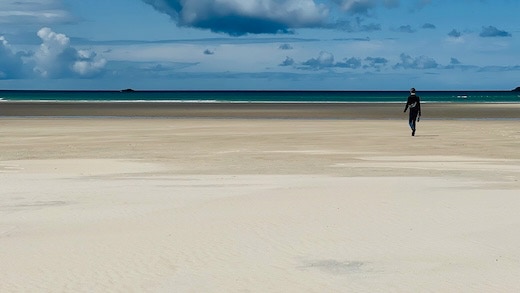 Retour sur le continent … enfin, non, l’Irlande est aussi une île ! Nous prenons un café et un gateau dans un restaurant du port avant de terminer notre étape jusqu’à Annagry par de toutes petites routes. Avant d’aller à l’hôtel, nous faisons évidemment un détour par l’aéroport international de Donegal (le conté, pas la ville). Un petit aéroport a vrai dire avec juste quelques vols quotidiens d’Air Lingus. On voit juste le décollage d’un ULM. Mais comme l’aéroport longe une belle plage de sable blanc, qu’il fait beau et que nous ne sommes pas pressés, nous nous posons un peu sur la plage. J’en profite pour me détendre un peu dans l’eau turquoise. Pas trop de méduses en vue !