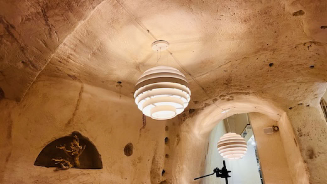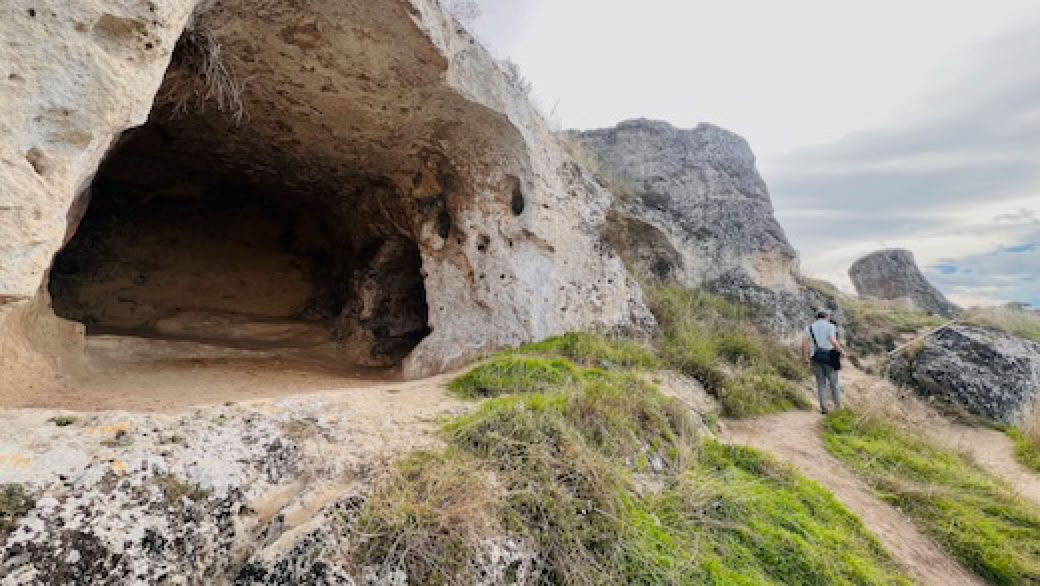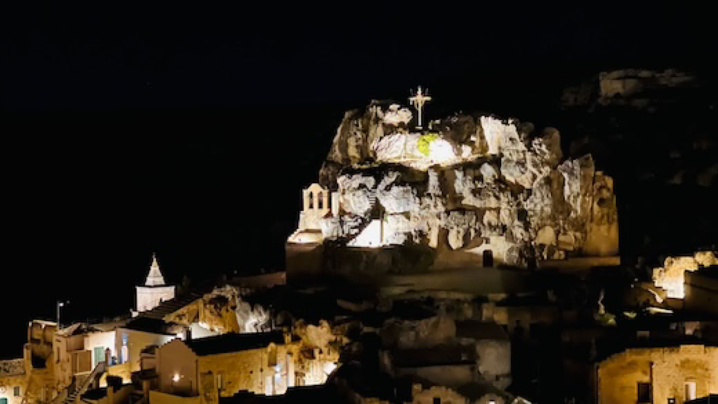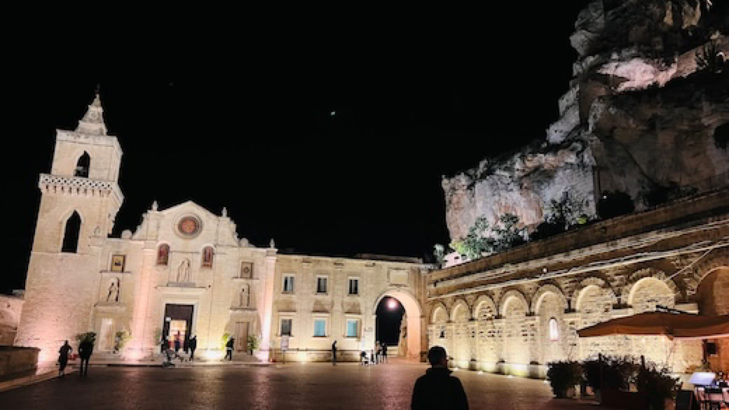 Départ de l’appartement un peu avant 7h, un coup de RER E et B pour arriver à CDG 2F vers 8h. Les bornes automatiques de Check-In sont hors-service et seulement 2 personnes aux comptoirs Air-France pour déposer les bagages … Heureusement, nous avons de la marge, et la sécurité est passée rapidement. L’avion décollera finalement avec 20’ de retard, mais grâce aux contrôleurs italiens et au vent arrière, notre A321 arrivera à l’heure à Rome et avec le beau temps ! Les bagages sont délivrés assez rapidement et avant de récupérer la voiture de location, nous nous restaurons rapidement d’une focaccia. Nous avons bien du mal ensuite à trouver les guichets des sociétés de location de voitures et après un détour par la gare ferroviaire, nous trouvons finalement le guichet Sixt, et récupérons une Jeep Compass PHEV 4x4 au lieu de l’Alfa Junior que j’avais réservée. Un peu vieille et le réservoir pas complètement plein, mais finalement, cette grosse voiture sera bien confortable et pratique sur tout notre séjour. Nous partons donc pour 5 bonnes heures de route pour descendre à Matera. Le paysage devient intéressant une bonne centaines de kilomètres avant Matera : valloné et désertique, de longues lignes droites limitées à 70 km/h … où tout le monde roule entre 90 et 100 km/h. L’arrivée à Matera n’est pas très engageante, mais notre hôtel « Casino-Ridola » est très joli, dans une grande villa au style bien italien. Nous nous installons dans notre chambre spacieuse, au plafond vouté, dotée d’une immense terrasse … et au matelas très dur. Vers 18:30 (il fait déjà nuit), nous partons à pied vers le centre historique, à 10’ de l’hôtel. C’est un choc visuel ! Un incroyable enchevêtrement de ruelles, d’escaliers, de petites maisons, de rochers, d’églises. Tout est mineral, y compris le pavage en pierres blanches des rues. En bas de la ville, un canyon. On aurait envie de tout explorer mais nous avons faim et nous trouvons un restaurant agréable, avec une terrasse qui donne sur une belle esplanade, le Keiv. Et nous dînons donc en terrasse … un 25 octobre ! Premier Spritz, du bon vin blanc, une bonne cuisine italienne … les vacances commencent bien ! Il faut quand même remonter toute la vieille ville pour retourner à l’hôtel !