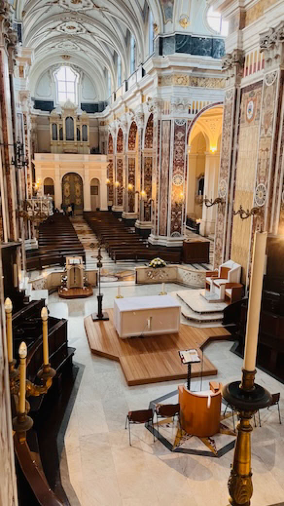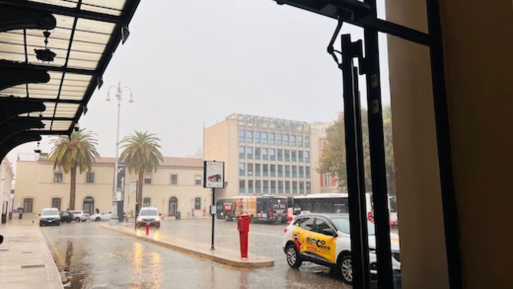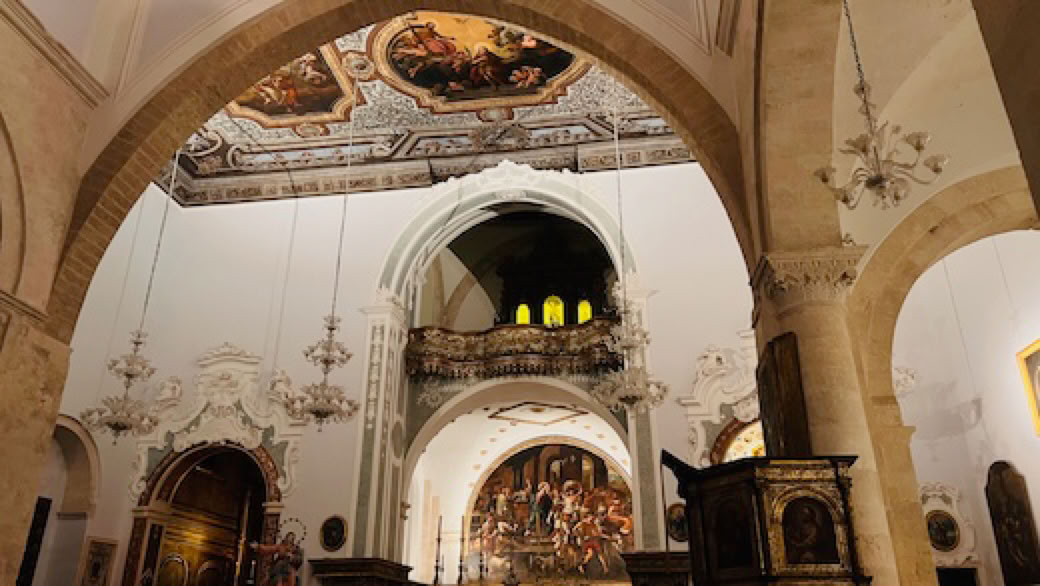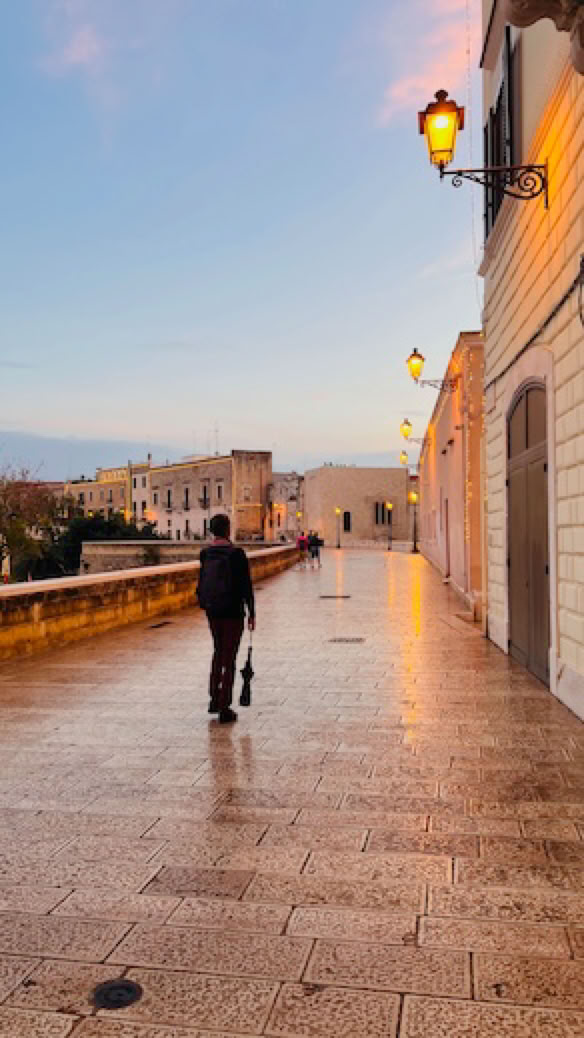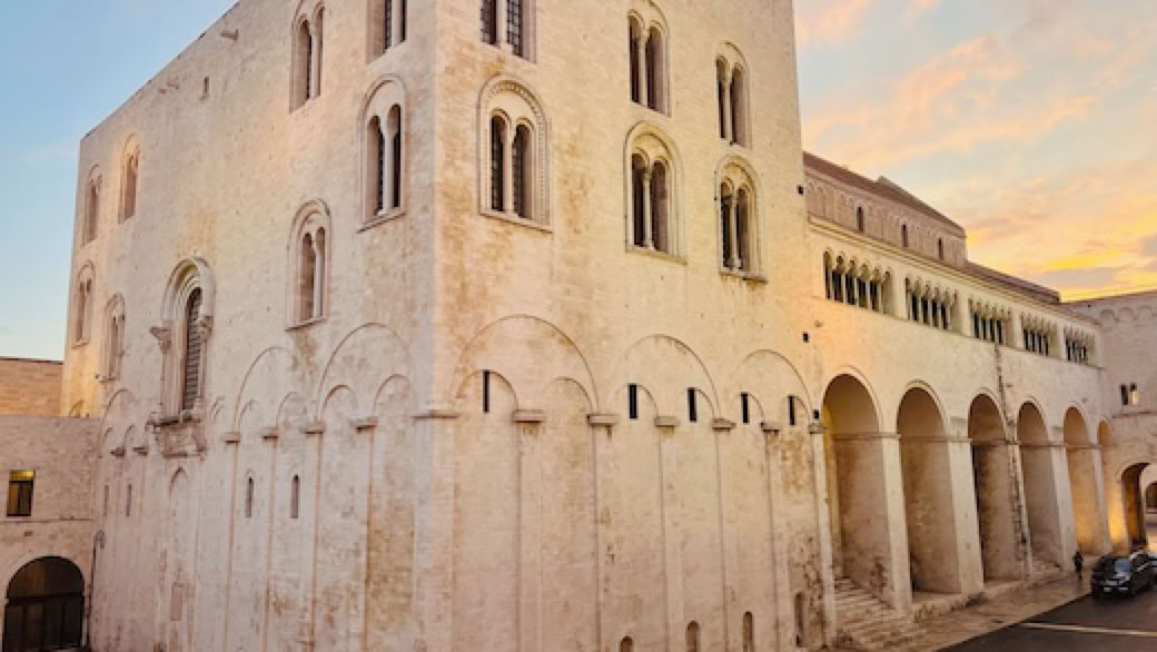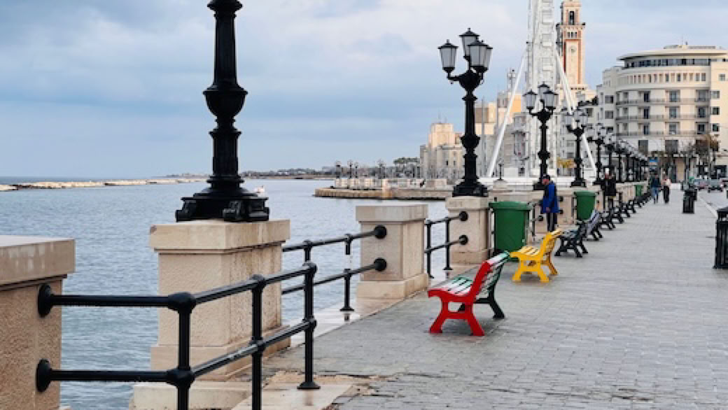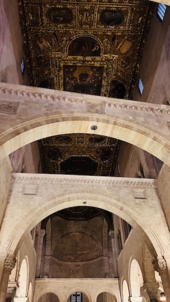 Après une pause, nous partons à la gare de Polignano pour prendre le train pour Bari, la capitale des Pouilles. Nous avons un peu de mal à comprendre le système de paiement « tap tap » mais nous voilà confortablement installés pour 45’ de train. Arrivés à Bari, une très grosse averse nous accueille. Nous restons tranquillement 10’ à l’abri de la gare avant d’aller vers le centre et le bord de mer. Nous nous promenons d’abord sur la jolie digue au style romantique avec ses lampadaires en fer forgé, nous admirons un rameur athlétique dans son canoë-kayak sur la mer calme, Nous montons ensuite dans la vieille ville et son chateau, nous trouvons une bonne patisserie car Pierre est au bord de l’hypoglycémie, puis redescendons vers le port de commerce. Le jour tombe déjà. Je remarque une étrange construction, une forme d’église en transparence, faite d’un treillis métallique. Nous nous approchons et il s’agit effectivement d’une oeuvre en construction qui reproduira une ancienne église qui occupait ce site. C’est une très belle idée, et ce sera à revoir une fois terminé. Nous visitons enfin la très belle Basilica Pontificia San Nicola, une église d’inspiration romane, à la décoration plus sobre que la moyenne des églises italiennes, avec néanmoins un superbe plafond peint et avec la particularité d’une arche légèrement en diagonale par rapport à la nef. Enfin, nous retournons vers la gare de Bari, en passant cette fois par les « Champs-Elysées » de la ville, la Via Sparano da Bari, toute illuminée. Retour à Polignano en train.