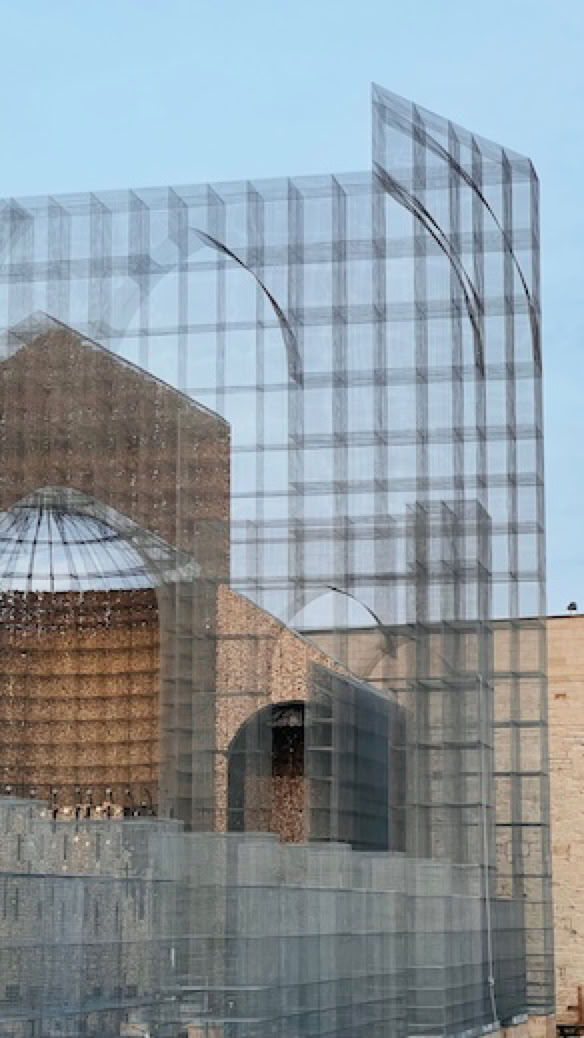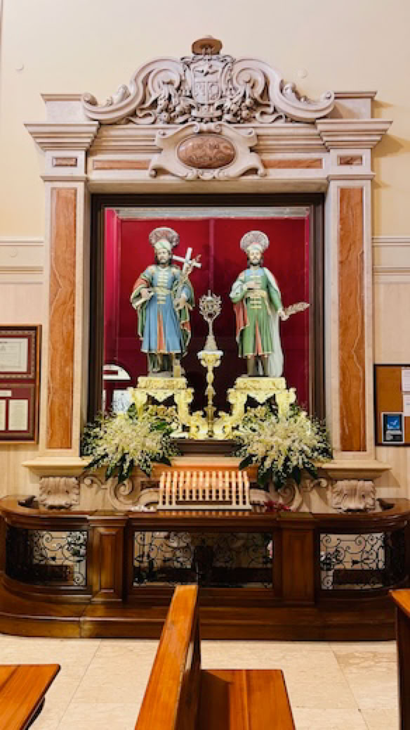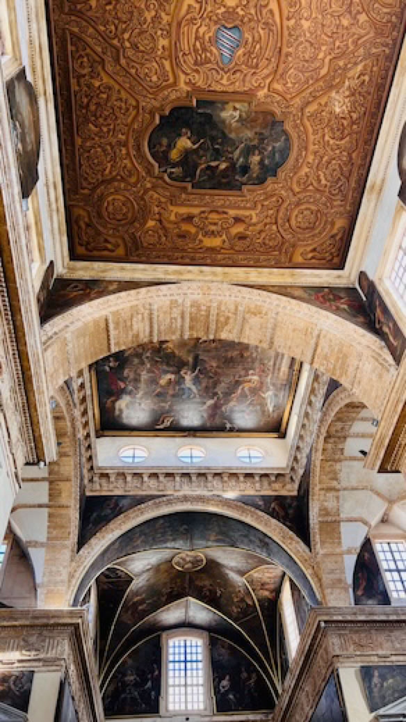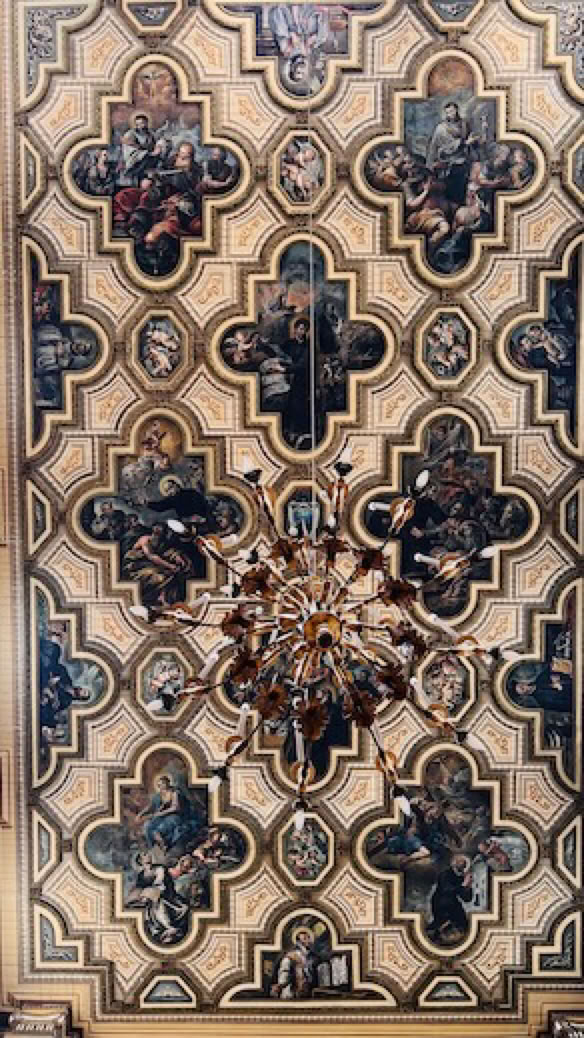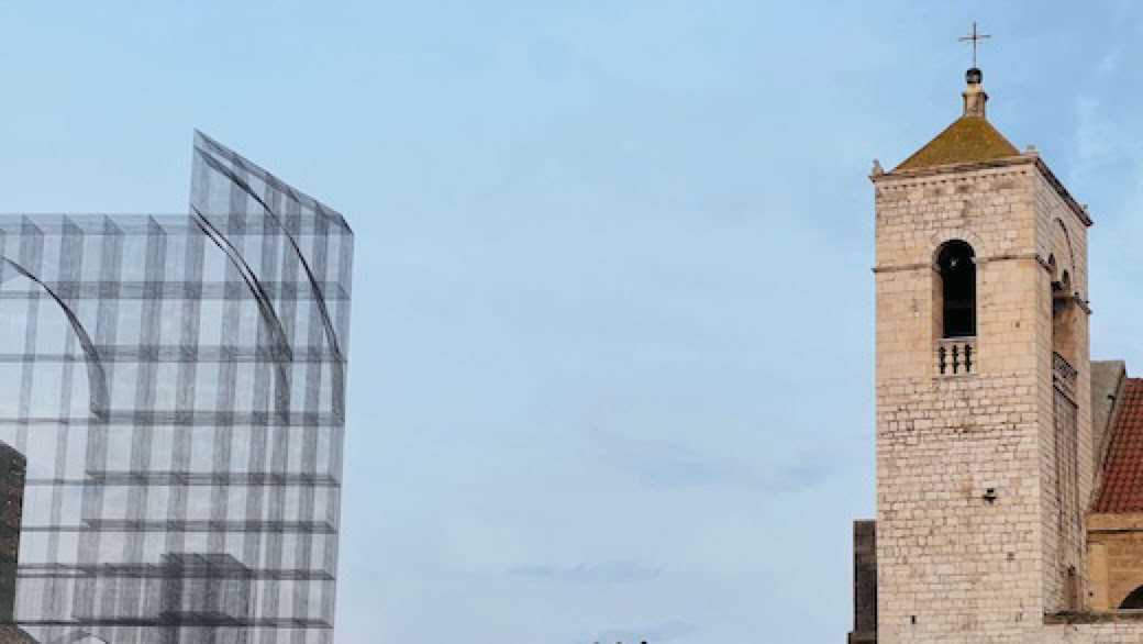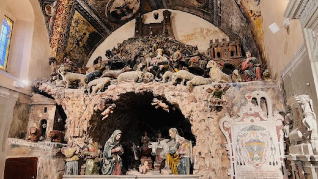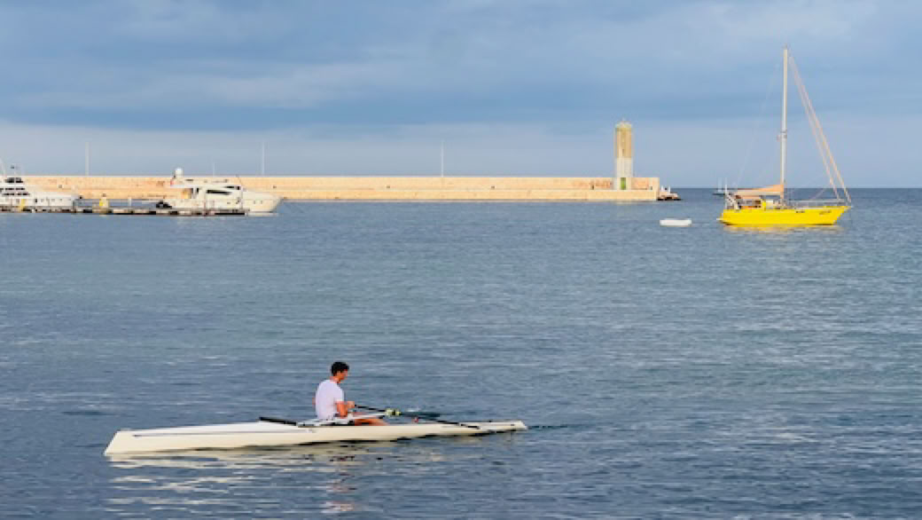 Après une pause, nous partons à la gare de Polignano pour prendre le train pour Bari, la capitale des Pouilles. Nous avons un peu de mal à comprendre le système de paiement « tap tap » mais nous voilà confortablement installés pour 45’ de train. Arrivés à Bari, une très grosse averse nous accueille. Nous restons tranquillement 10’ à l’abri de la gare avant d’aller vers le centre et le bord de mer. Nous nous promenons d’abord sur la jolie digue au style romantique avec ses lampadaires en fer forgé, nous admirons un rameur athlétique dans son canoë-kayak sur la mer calme, Nous montons ensuite dans la vieille ville et son chateau, nous trouvons une bonne patisserie car Pierre est au bord de l’hypoglycémie, puis redescendons vers le port de commerce. Le jour tombe déjà. Je remarque une étrange construction, une forme d’église en transparence, faite d’un treillis métallique. Nous nous approchons et il s’agit effectivement d’une oeuvre en construction qui reproduira une ancienne église qui occupait ce site. C’est une très belle idée, et ce sera à revoir une fois terminé. Nous visitons enfin la très belle Basilica Pontificia San Nicola, une église d’inspiration romane, à la décoration plus sobre que la moyenne des églises italiennes, avec néanmoins un superbe plafond peint et avec la particularité d’une arche légèrement en diagonale par rapport à la nef. Enfin, nous retournons vers la gare de Bari, en passant cette fois par les « Champs-Elysées » de la ville, la Via Sparano da Bari, toute illuminée. Retour à Polignano en train.