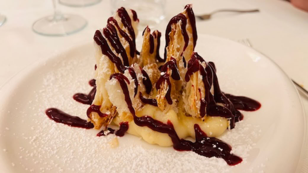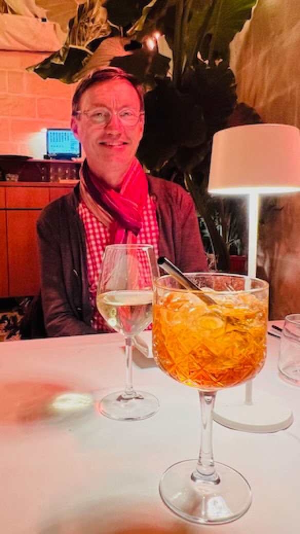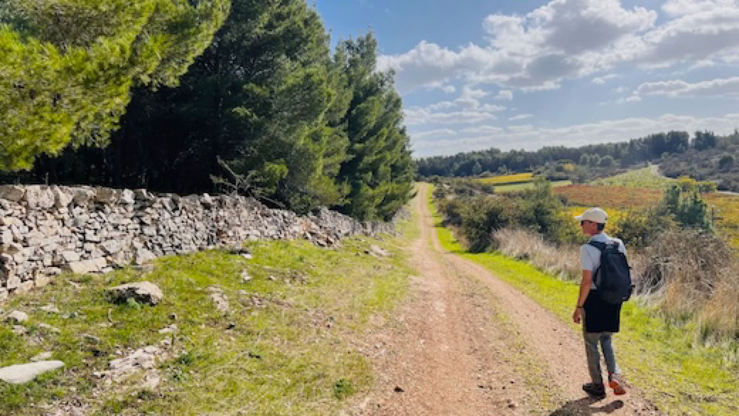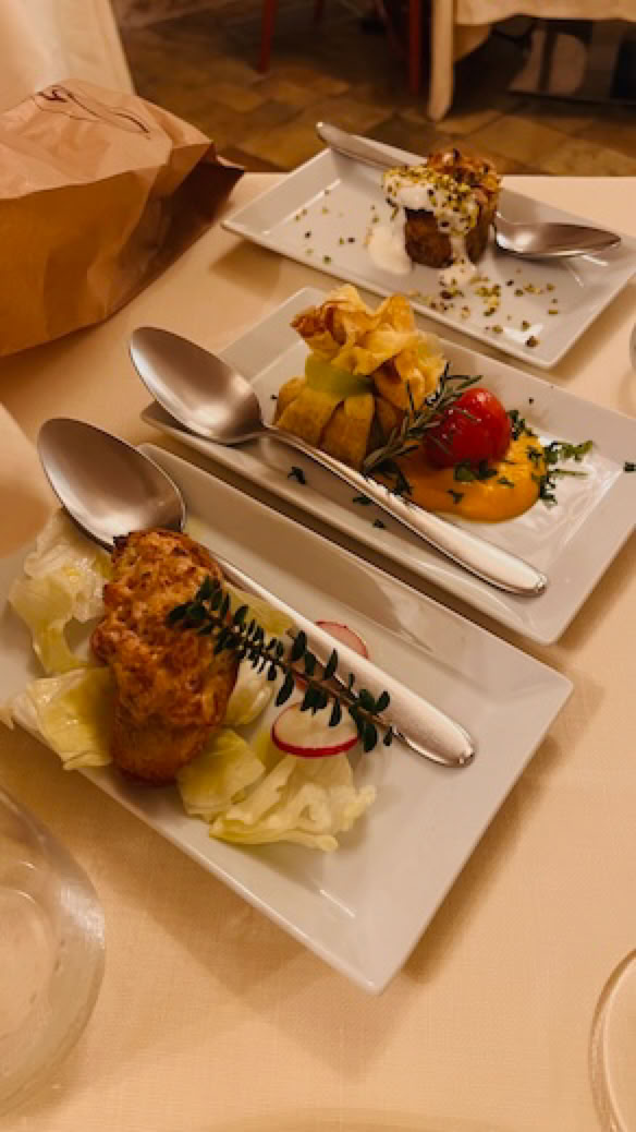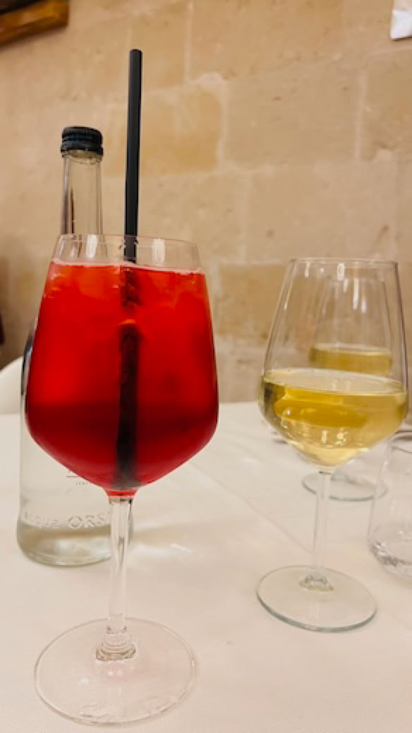 Nous reprenons la voiture et Pierre a repéré une randonnée pédestre à quinze kilomètres de là. Mais pour arriver au départ de cette randonnée, nous nous retrouvons avec la voiture sur un chemin de terre, plein de trous et de flaques. Mais nous avons une Jeep 4x4 et, au ralenti, nous arrivons sans encombre au départ de la randonnée, dans un endroit très isolé. C’est parti. Le chemin passe d’abord dans la forêt, puis une petite route longe des plantations de vieux oliviers au tronc épais … mais nous passons aussi le long de quelques maisons isolées avec des chiens très menaçants … heureusement derrière des grillages, mais nous ne sommes guère rassurés. Nous arrivons au pied d’un aqueduc (pas romain), sur lequel le chemin de randonné est aménagé. Belle vue sur la région, jusqu’à la mer. Nous continuons … y compris quand des panneaux indiquent que le passage est interdit … mais nous n’allons pas refaire tout le chemin dans l’autre sens. Petit moment de stress quand le chemin redescend dans la forêt et que nous entendons des voix … Finalement, aucun problème et nous retrouvons la voiture après 2h de marche, et avant le coucher du soleil. Retour à l’hôtel à Matera. Pierre nous a trouvé un restaurant, a priori à quelques minutes à pied … mais en fait, à l’autre bout de la ville, hors du secteur touristique. Après une 1/2 heure de marche, nous arrivons au restaurant ‘900 Taccardi, extérieurement pas extraordinaire, mais qui s’avère être finalement une très bonne adresse. Je découvre au passage le Spritz Campari : plus amère, intéressant. J’aime bien.