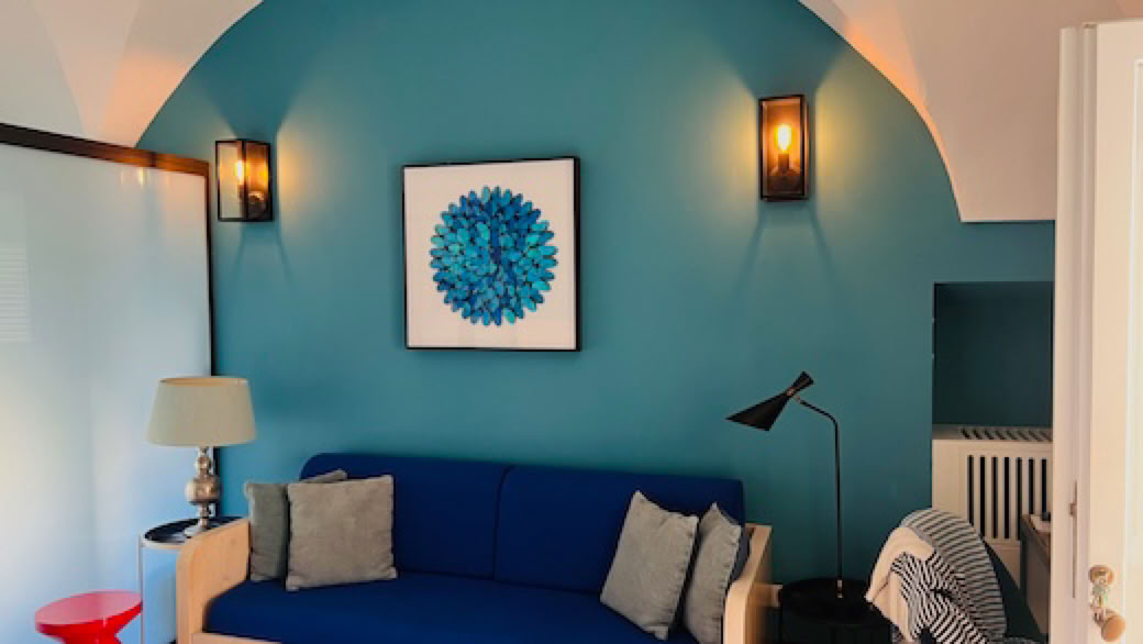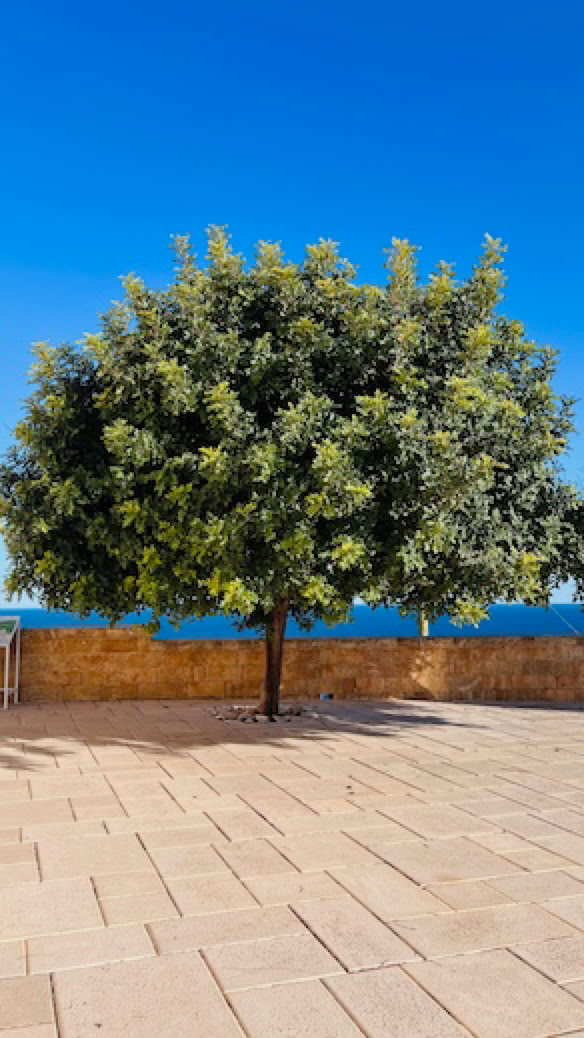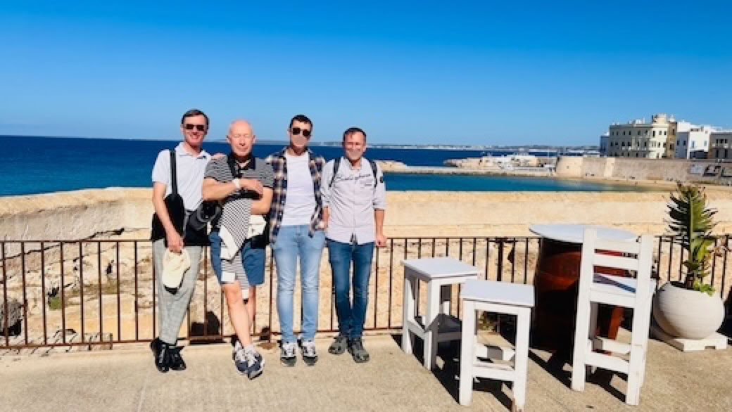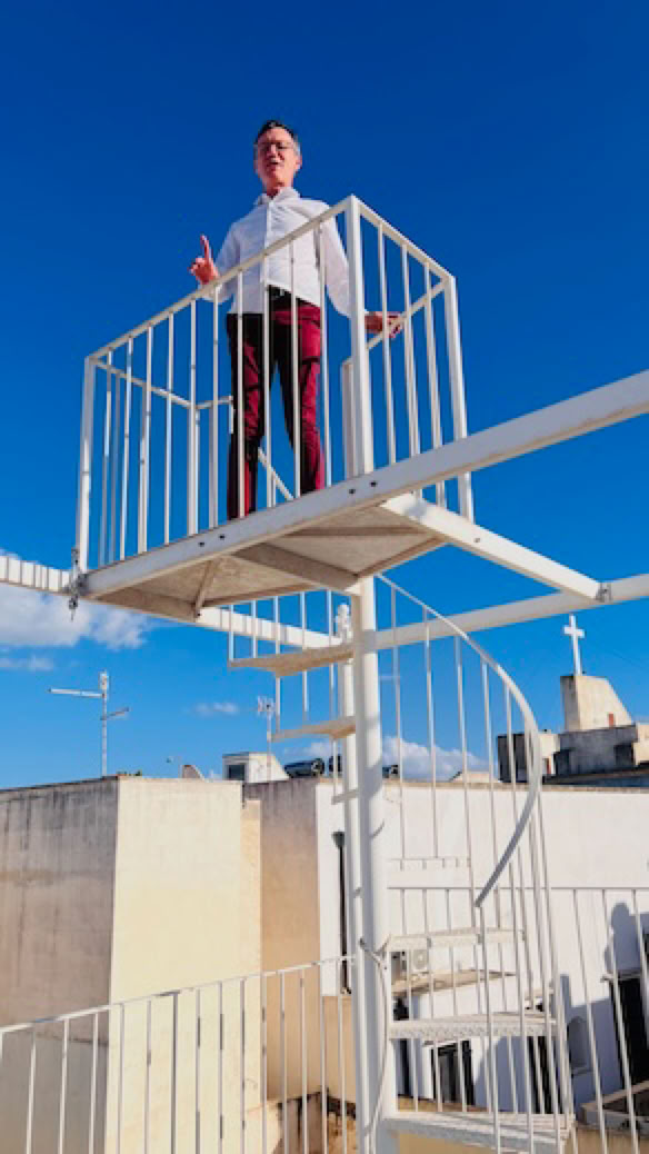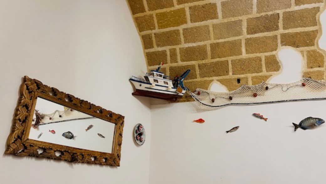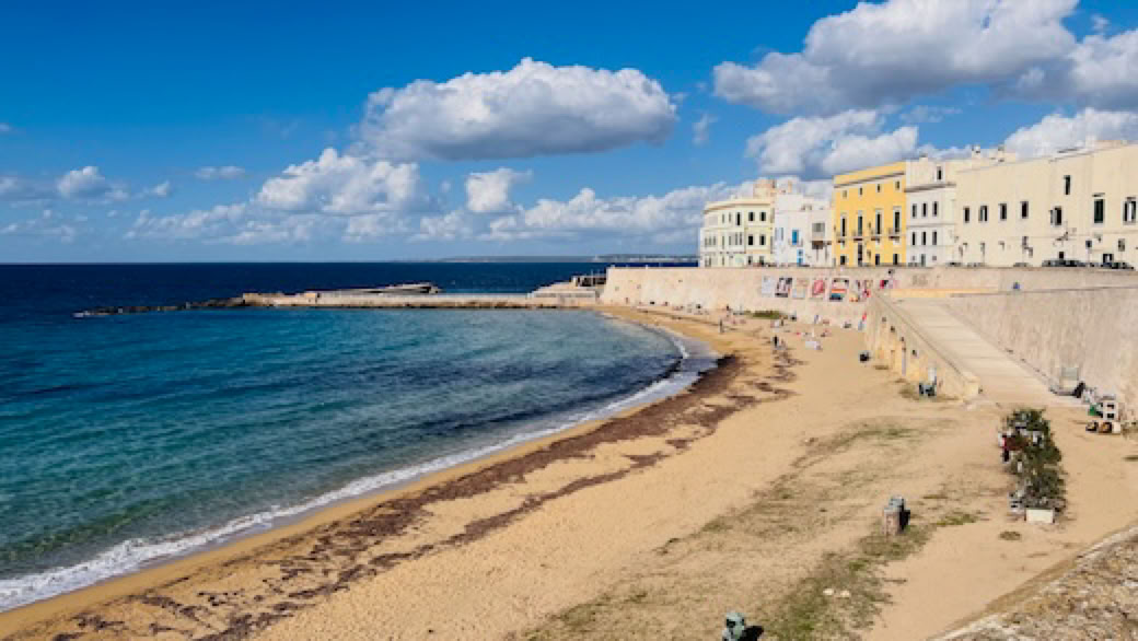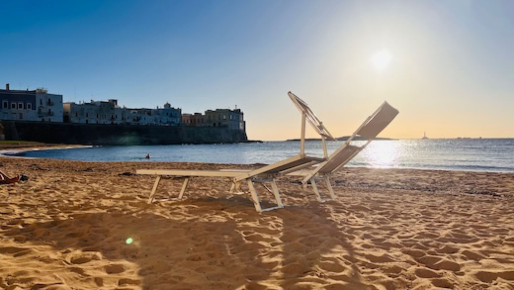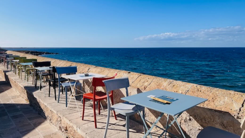 Après un dernier bon petit déjeuner à l’hôtel Casino Ridola et un café au soleil au bord de la piscine, nous prenons la route vers Gallipoli via Tarente, trés industriel, et en suivant plutôt des routes secondaires le long de la côte Ouest du talon de la botte. Pause café et plein de la Jeep vers 11h dans une station ENI et arrivée à Gallipoli à 13h. Nous garons la voiture sur le parking du port et découvrons le charmant front de mer de la ville historique. Il fait vraiment très beau, et nous nous installons au soleil sur les petites tables colorées d’un café, en surplomb de la mer et de la plage. Nous mangeons un peu, en profitant de la vue, et en attendant la disponibilité de notre logement. Vers 14:30, nous allons Via Galateo où se trouve notre « hôtel ». Dans une ancienne maison bourgeoise, toute en hauteur, notre chambre se trouve tout en haut, accessible par d’étroits escaliers de pierre extérieurs. Pas facile avec les valises, mais nous avons une petite terrasse privative et la décoration de la chambre est moderne et chaleureuse. Au dessus de la chambre, il y a encore une autre terrasse et même une sorte de vigie avec vue que Pierre aura le courage d’essayer.