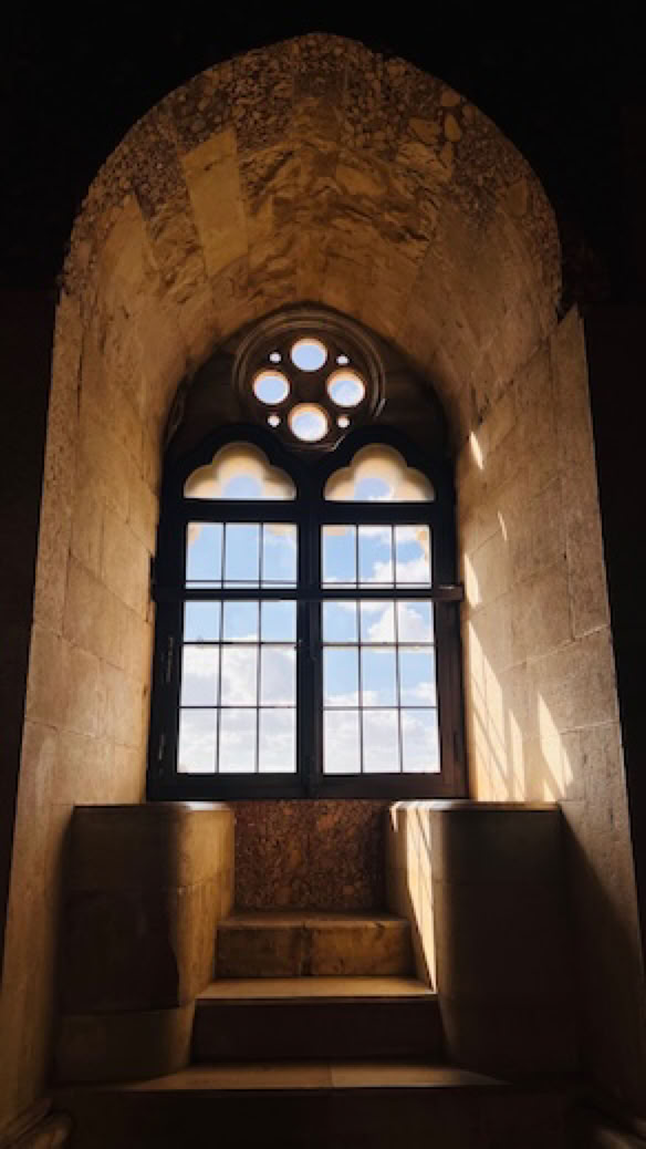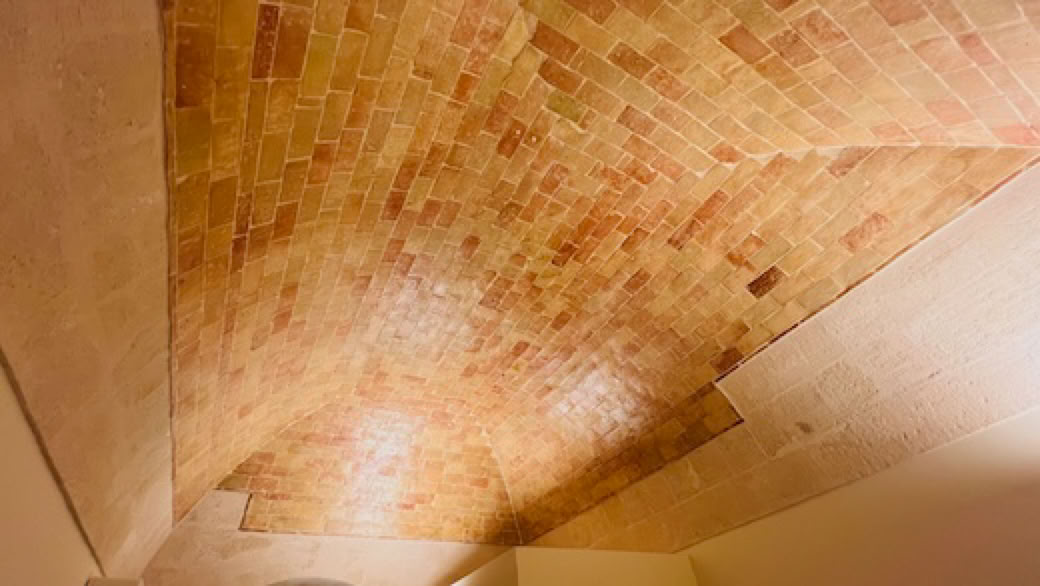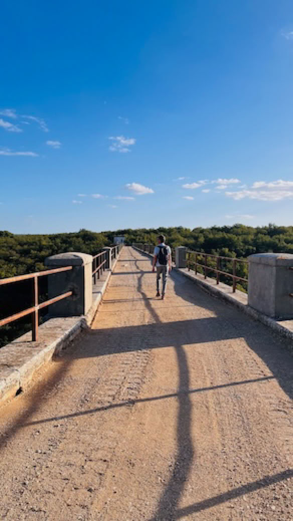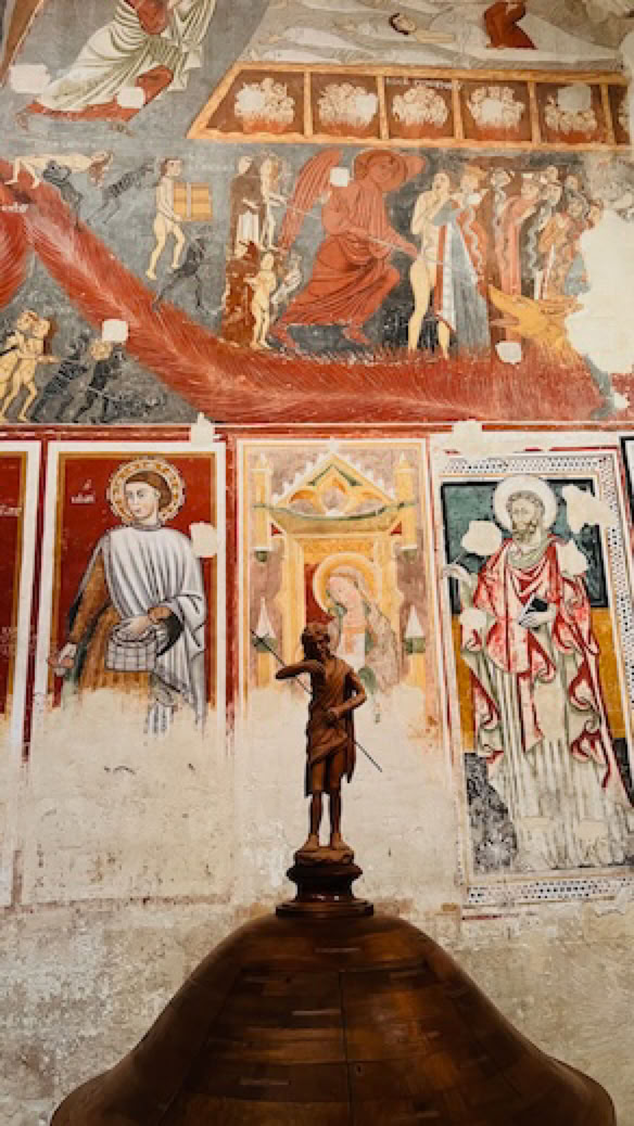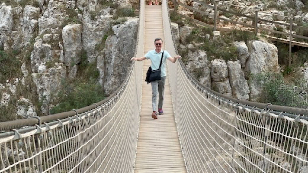 Nous partons à la découverte, en plein jour cette fois, de cette ville étonnante. Beaucoup de touristes (dont beaucoup de français, d’ailleurs). Il fait très beau, voire chaud. Nous parcourons les rues principales, pavées de pierre blanches. Nous entrons dans quelques-unes des nombreuses églises, dont la belle église romane Saint Jean Baptiste qui tranche avec les autres églises à la décoration riche et baroque. En fin de matinée, nous voulons visiter la cathédrale mais l’office dominical est en cours. Nous prenons notre café américano en terrasse en face de la cathédrale. Nous redescendons en bas de la ville par la rue pavée qui borde le canyon. Nous y trouvons le départ de la randonnée qui mène de l’autre côté du canyon et décidons, un peu à l’improviste et sans eau ni casse-croute, de faire la randonnée. Evidemment, ça descend d’abord fort, puis au fond, pour traverser la rivière, une magnifique passerelle suspendue, qui bouge bien quand on la traverse. Petit moment d’émotion … qui se poursuit car le chemin qui monte sur l’autre versant est aussi impressionnant. Le chemin passe devant des grottes qui ont servi d’habitat troglodytique, et devant une église rupestre qu’on aperçoit à travers des grilles. Une dernière échelle pour arriver sur le plateau. L’endroit permet d’avoir une belle vue panoramique sur la ville, y compris la partie la plus ancienne, abandonnée. Après un moment de contemplation, nous entamons le retour. Pierre anticipe avec appréhension le nouveau passage sur la passerelle, mais tout se passe bien, et nous revenons en ville … assoiffés. Nous nous rafraîchissons d’une limonade dans un café, nous achetons une focaccia dans une bonne boulangerie et retournons nous reposer à l’hôtel dans notre belle chambre. Vers 16h, nous retournons dans le centre pour la visite de la cathédrale et de son musée attenant. La nuit tombe vite, à 17:00, il fait déjà presque nuit. Nous visitons aussi la très jolie église Saint Pierre et Paul, avec son superbe plafond en bois peint. Pierre y met un Euro pour l’éclairer 😊. Retour à l’hôtel, j’en profite pour faire quelques brasses dans la piscine extérieure, froide. Enfin, nous redescendons en ville pour le dîner chez Francesca. La salle du restaurant est creusée dans la roche. La cuisine est excellente, le vin blanc de la région est très bon et le service agréable. Bref, une bonne adresse. C’est donc bien fatigués que nous remontons une dernière fois à l’hôtel pour une bonne nuit.