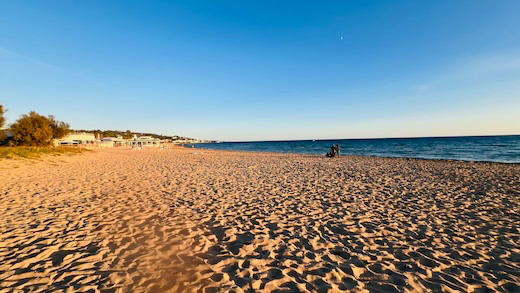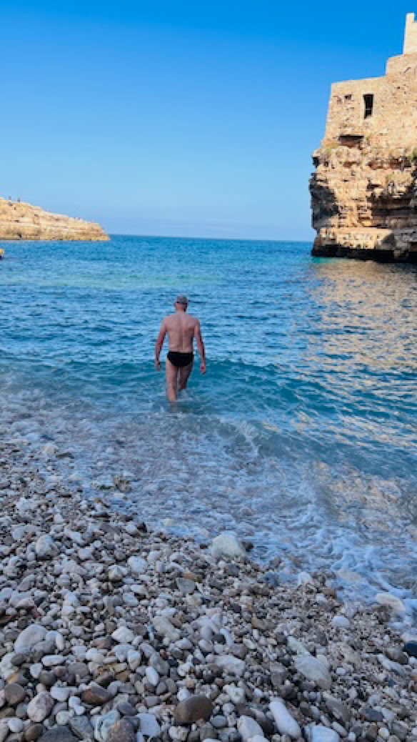 Nous reprenons la route pour une dernière étape touristique à Monopoli (avec un « i » …). Le parking est assez loin du centre et les rues que nous longeons n’ont rien d’extraordinaire. Par contre, le petit port historique du centre est charmant, avec toute ses barques bleues. Nous nous promenons dans les vieilles rues, Pierre s’énerve sur une exposition extérieure de photos sur les déchets, et nous terminons par la visite de l’imposante cathédrale très richement décorée et avec une vrais particularité : une « terrasse » monumentale au fond du choeur qui permet de dominer l’autel et la nef. C’est notre dernier jour de vacances, avant le retour, et nous nous installons en fin de journée sur une petite plage pour notre dernier coucher de soleil dans les Pouilles (coucher de soleil dans le dos … car nous sommes sur la côte Adriatique, à l’Est !). Petit moment de nostalgie avant de reprendre la voiture pour Polignano.