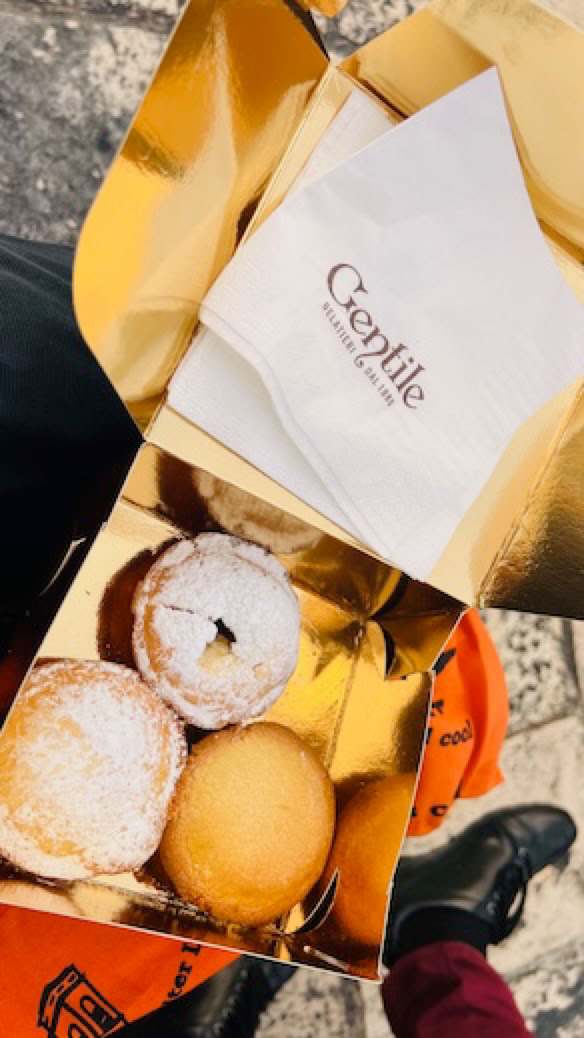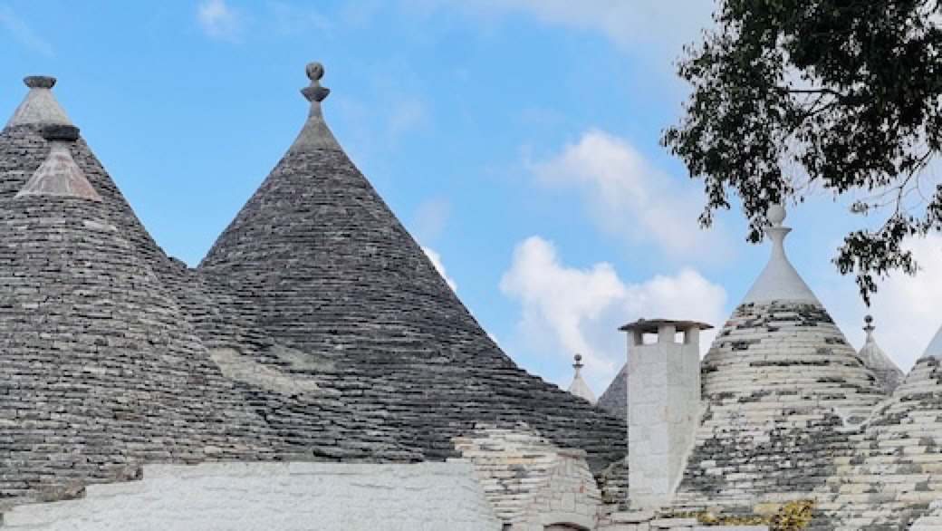 Impossible de séjourner à Polignano, surtout sous ce beau soleil, sans se baigner sur la plage au pied des falaises (la plage « Lama Monachile »). Et donc vers 10:30, je m’avance en maillot de bain sur les galets, glisse, et me retrouve rapidement dans l’eau ! En fait l’eau est vraiment très bonne (un 1er novembre …) et je passe un très bon moment dans l’eau, avec pas mal de poissons colorés à observer sous l’eau. Et le cadre pour nager est exceptionnel. Vu le nombre de touristes en surplomb de la plage, je me dis que je vais être sur beaucoup de photos :) ! Je resterais volontiers plus longtemps dans l’eau, mais Pierre m’attend au bord avec mes affaires. Encore un bon café en terrasse et nous retournons à l’hôtel pour prendre la Jeep, direction Alberobello : le lieu est célèbre pour ses « trulli », typiques de cette région. Ce sont d’anciennes habitations d’ouvriers agricoles, de forme circulaire, avec un toit conique en pierre. On en voit déjà dans la belle campagne en approchant d’Alberobello. Nous garons la voiture, gratuitement cette fois, un peu à l’écart du centre. Nous visitons la Chiesa dei Santi Cosma et Damiano puis rejoignons le quartier des trulli. Honnêtement, c’est un peu Disneyland, avec beaucoup de touristes et des centaines de trulli parfaitement blancs avec leurs toits de pierre impeccables et des boutiques de souvenir à l’intérieur. C’est néanmoins à voir et assez surprenant. On arrive quand même à trouver un endroit isolé pour se faire un beau selfie avec un trulli. Nous remontons en ville pour boire et manger un bon gâteau au Central Bar.