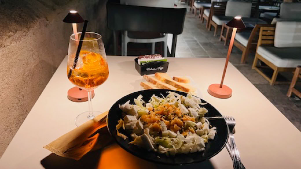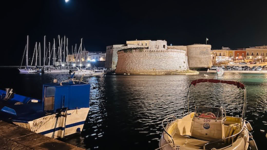 Retour enfin à Gallipoli. Comme Pierre a eu quelques problèmes digestifs pendant toutes la journée (restaurant de la veille ?), il préfère ne pas dîner, et je retourne sur le front de mer, au Mividia, pour manger en solitaire une bonne salade et une petite glace, accompagnés quand même d’un généreux Spritz. Je suis content d’avoir mon sweat à capuche car le froid est un peu tombé sur Gallipoli. Je termine la journée en me promenant un peu dans le quartier du port que nous n’avons pas encore visité.