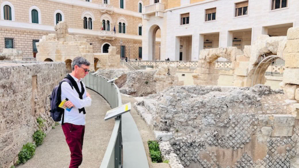Pierre a retrouvé la forme et nous quittons notre résidence Casa Galateo de Gallipoli à destination de Polignano a Mare, mais nous allons d’abord profiter du trajet pour visiter la belle ville de Lecce. C’est une grande ville et nous trouvons de la place dans un grand parking souterrain juste à l’extérieur du centre historique. Il fait chaud mais le ciel est couvert … Après avoir salué la statue de Giuseppe Garibaldi dans un parc, nous entrons dans la vieille ville. Puis nous passons devant la Basilica di Santa Croce, sans visiter (payant), nous visitons la Chiesa del Gesù et son impressionnant plafond de bois peint. Sur la grand place Sant’Oronzo se trouve un ancien amphithéâtre romain, donc seul un tiers environ a été excavé, le reste étant sans doute à jamais recouvert par la ville. Néanmoins la visite est intéressante et l’on apprécie toujours l’ingéniosité de construction des romains de l’époque. Il tombe quelques gouttes et il y a un peu de vent, ce qui ne nous empêche pas de prendre un americano en terrasse. Poursuite de la visite de la vieille ville, visite (payante) de l’impressionnante cathédrale et de son immense crypte. Avant de retourner à la voiture, nous entrons dans une librairie où j’achète un livre, « L’isola del giorno prima » d’Umberto Ecco … en italien (je viens de finir mon premier livre en italien, une petite romance gay « Se non fosse piu un segretto »).