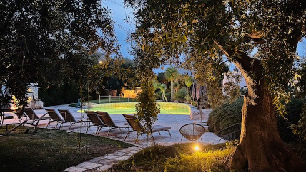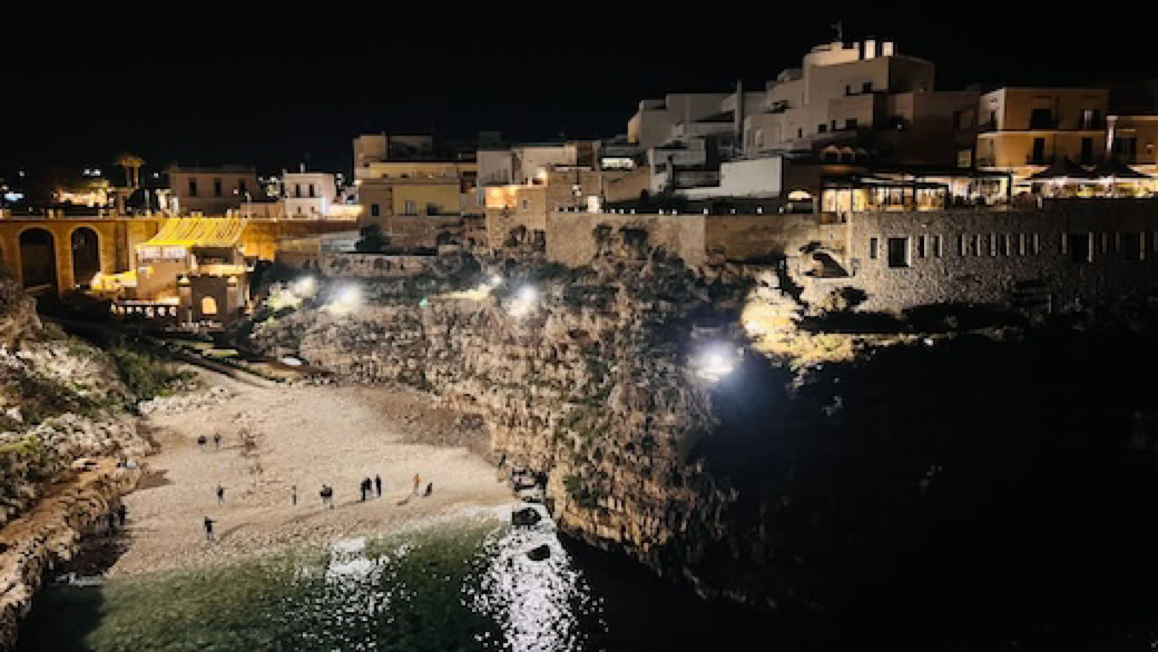 Nous arrivons finalement à Polignano a Mare. Notre résidence se trouve curieusement proche de la voie rapide, mais l’endroit est néanmoins plaisant et bien protégé, comme un petite résidence tropicale, avec les logements organisés autour d’une piscine, un bar de plein air, des palmiers, etc. La chambre est confortable. Le jeune réceptionniste nous conseille un restaurant pour le dîner, la « Villa degli Aranci » (villa des oranges). Très bel endroit, cuisine soignée, les filets de mon poisson du jour grillé sont levés devant nous sur une desserte, dessert local … Et le jardin du restaurant est une belle orangeraie, éclairée, dans laquelle nous nous promenons un peu avant d’aller découvrir le centre historique et la fameuse plage de Polignano au pied de falaises.